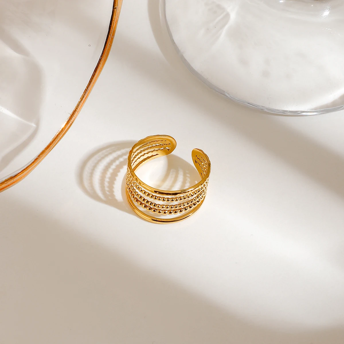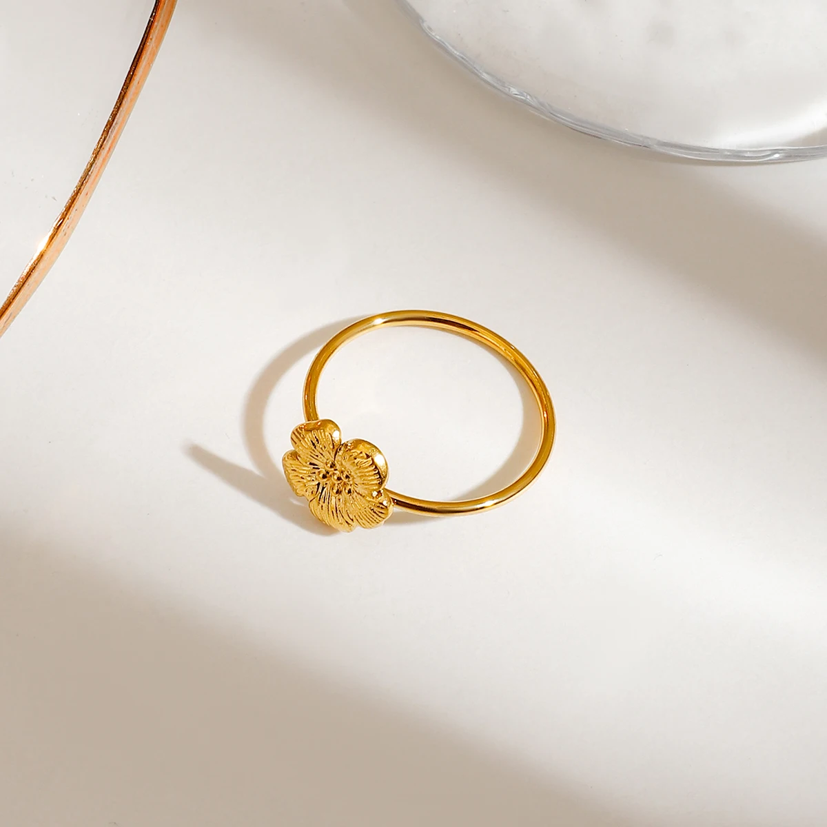 Set van 3 dames verfijnde 18K goud vergulde roestvrijstalen stapelbare ringen, met geribbelde bloem & vijflaagse geribbelde holle structuur