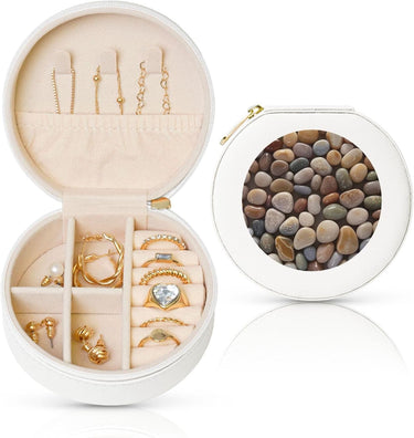 Small Jewelry Box Leather Travel Jewelry Case Waterproof Round Jewelry Organizer White For Womens Rings Necklaces Gifts Petoskey Stone