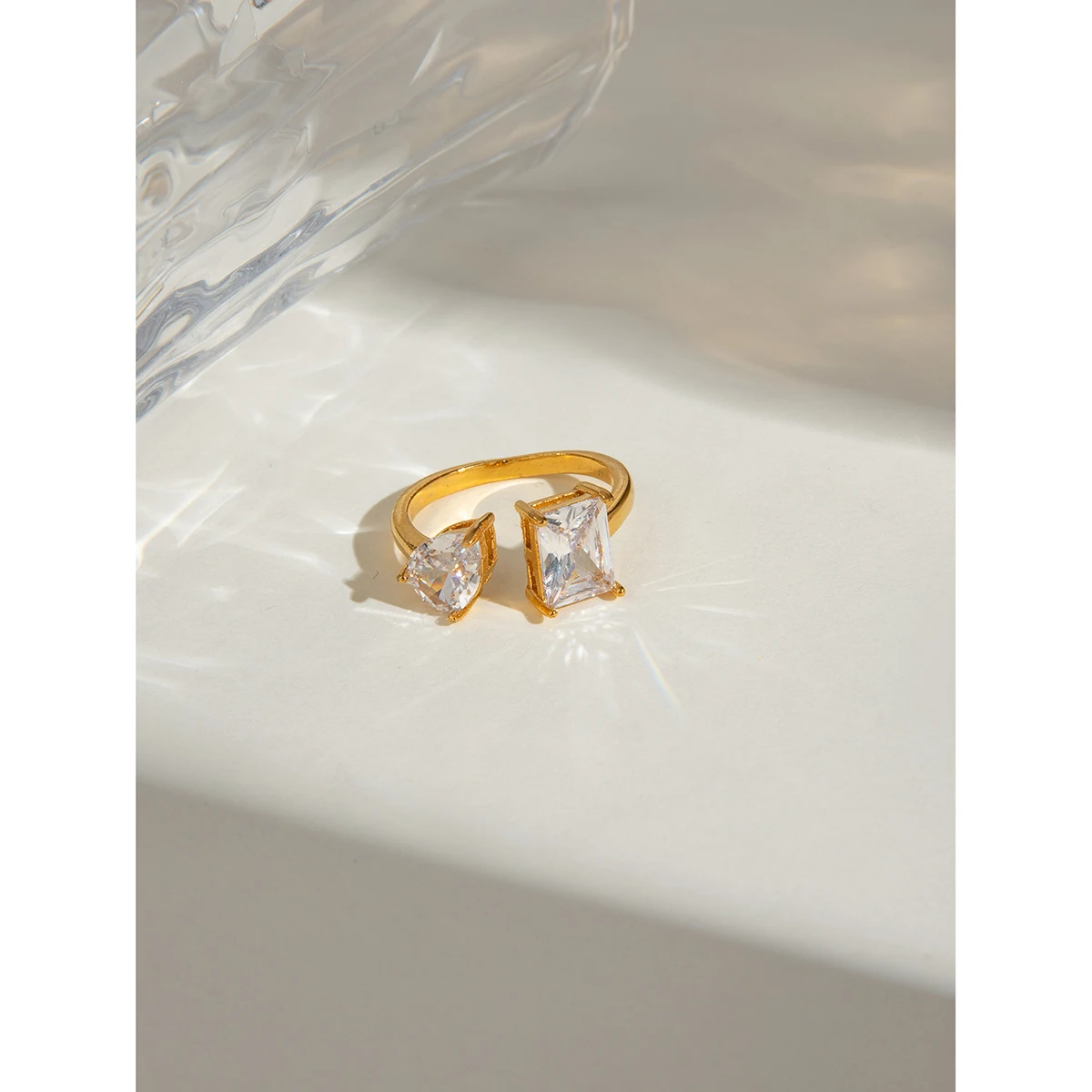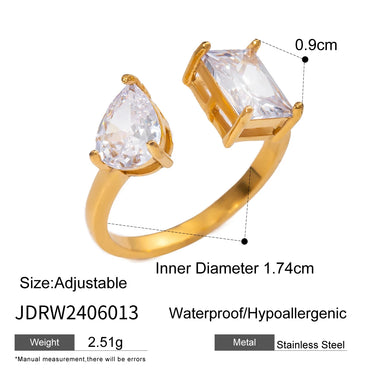 18K Goud Vergulde Roestvrijstalen Rechthoekige Druppelvormige Zirconia Open Eind Ring Dames Anti Allergische Metaal Statement Sieraden