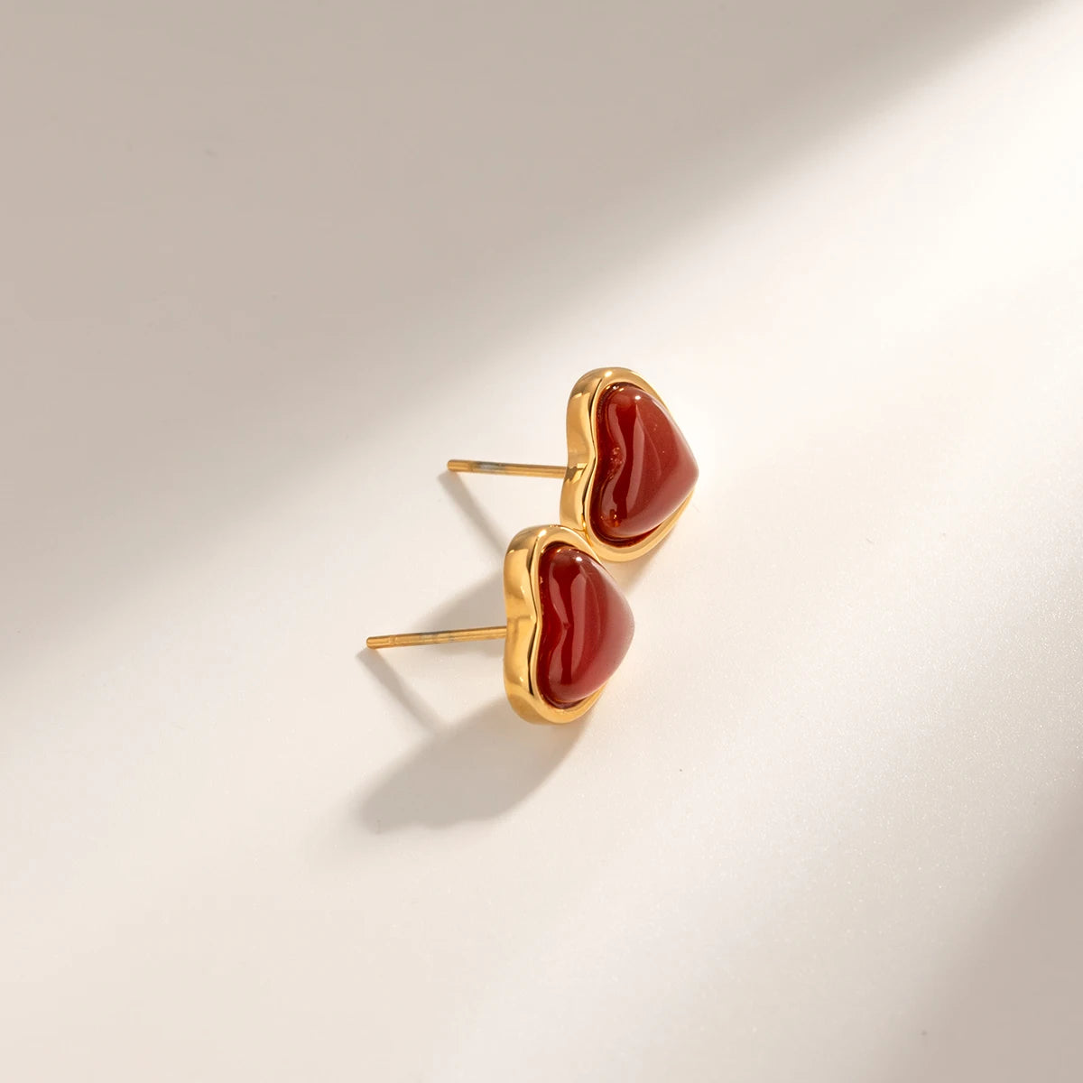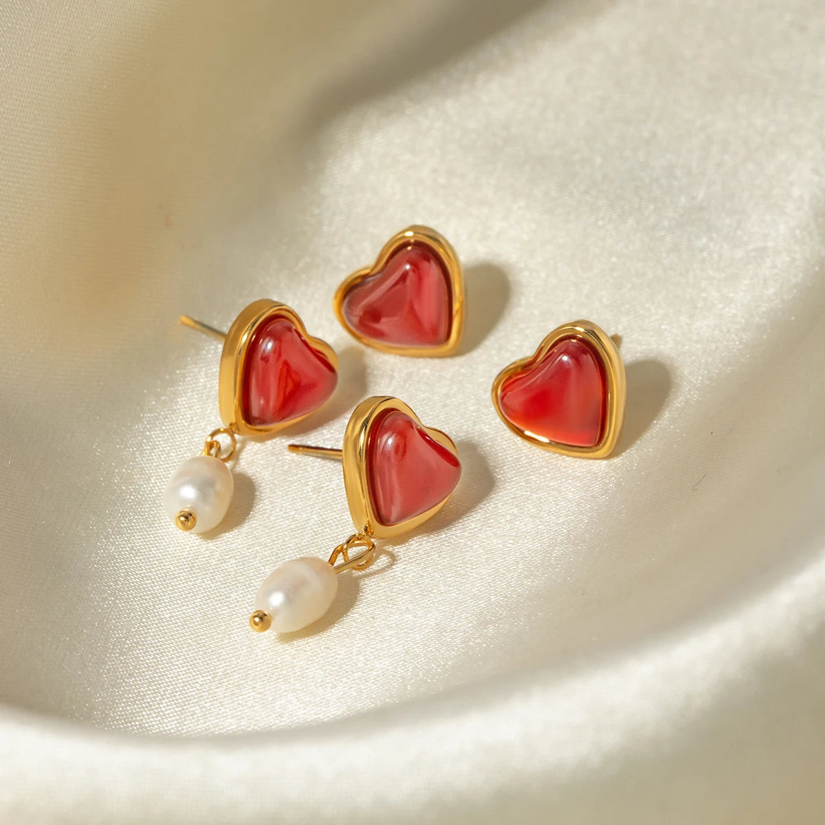 18k Goud Vergulde Dames Roestvrij Staal Liefdes Hart Zoetwaterparel Oorbellen Ingelegd Rode Agaat Statement Textuur Stevige Feest Cadeau