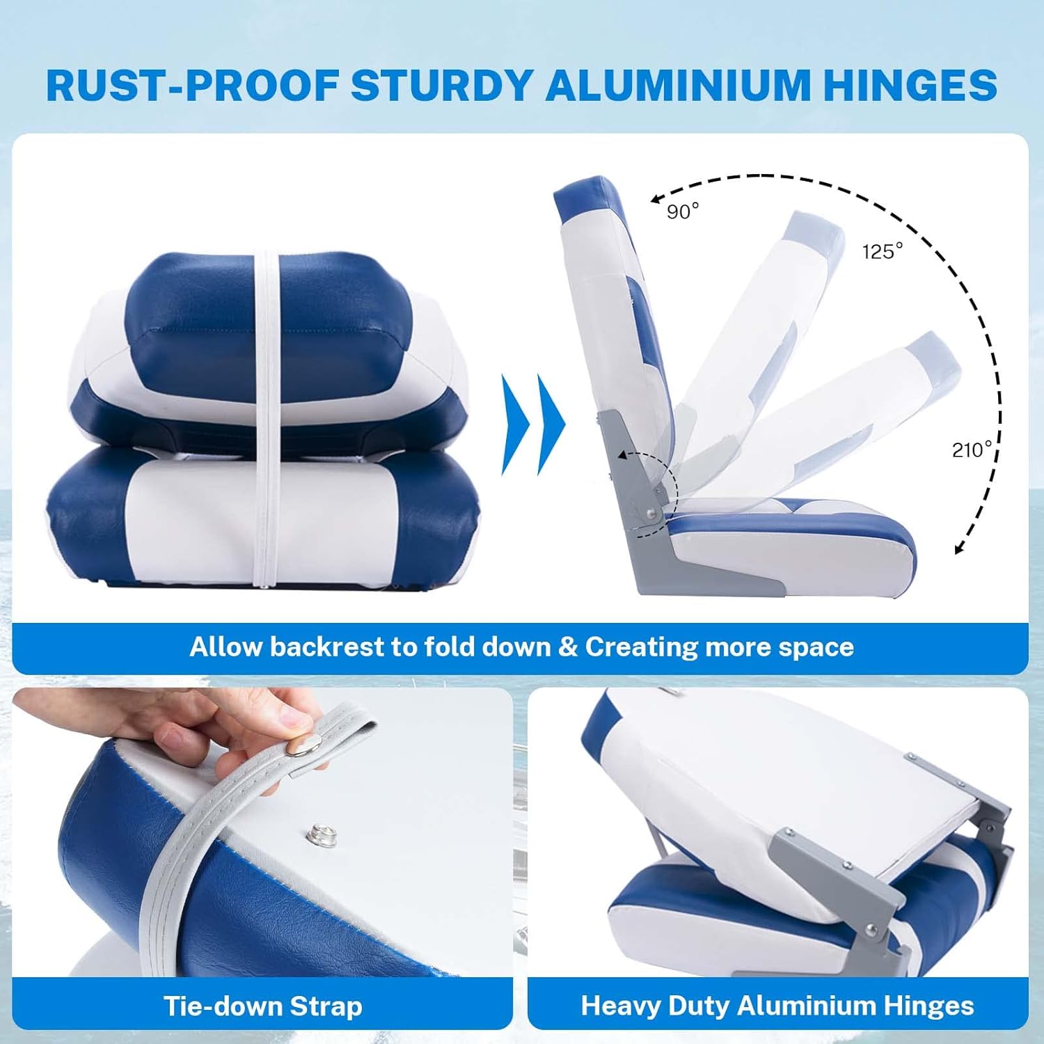 - 👍【Sturdy&Durable】Our Fishing Boat Seats are made of marine-grade vinyl with high quality water resistance, abrasion resistance, UV Resistant, tear resistance and easy-cleanable. Heavy-duty aluminum alloy hinges makes the backrest to fold down and flip easily which is prevented from flexing. The injected plastic seat base can load up to 400lbs. This boat chair can withstand the harsh marine environment and years of use.