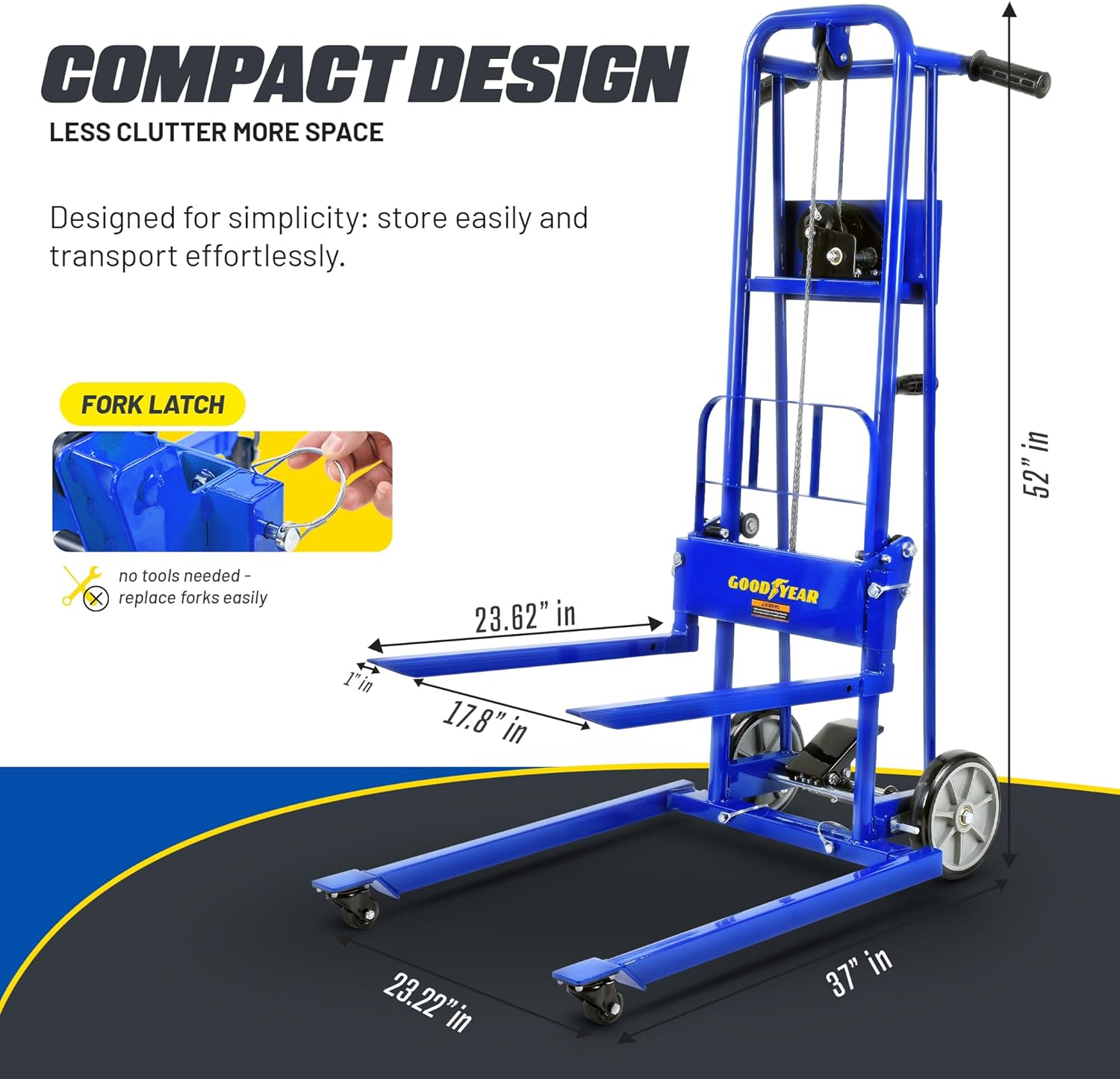 - HEAVY-DUTY LIFTING: The Goodyear Material Lift Stacker is an industrial-strength machine designed for heavy-duty lifting. With a loading capacity of up to 330 lbs., this lift stacker is a reliable alternative to forklifts and other freight transport machinery.