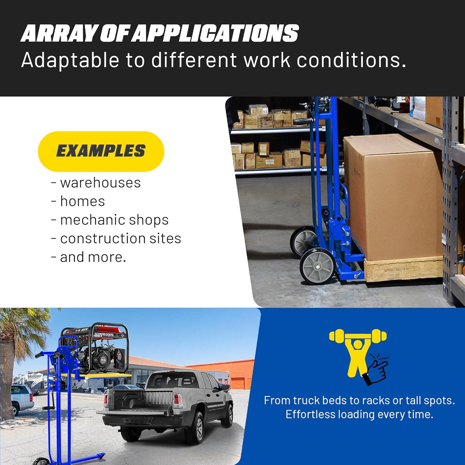 - VERSATILE FUNCTIONALITY: This material lift stacker can work in two modes, as a stacker to lift objects or as a hand truck to transfer materials. Its swivel casters and solid PU wheels ensure optimal driving performance, making it perfect for use in warehouses and loading docks.