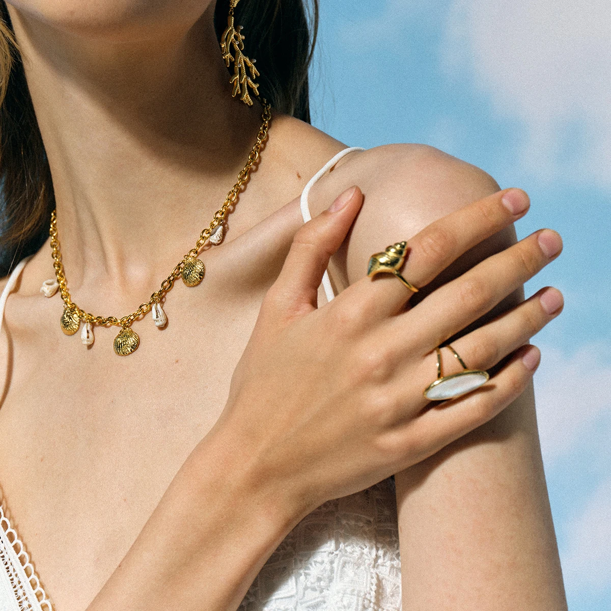 Pierścionek z teksturą muszli, pozłacany 18K złotem, modny, ze stali nierdzewnej, masywny, odporny na matowienie, damski, modny, geometryczny, metaliczny pierścionek z teksturą