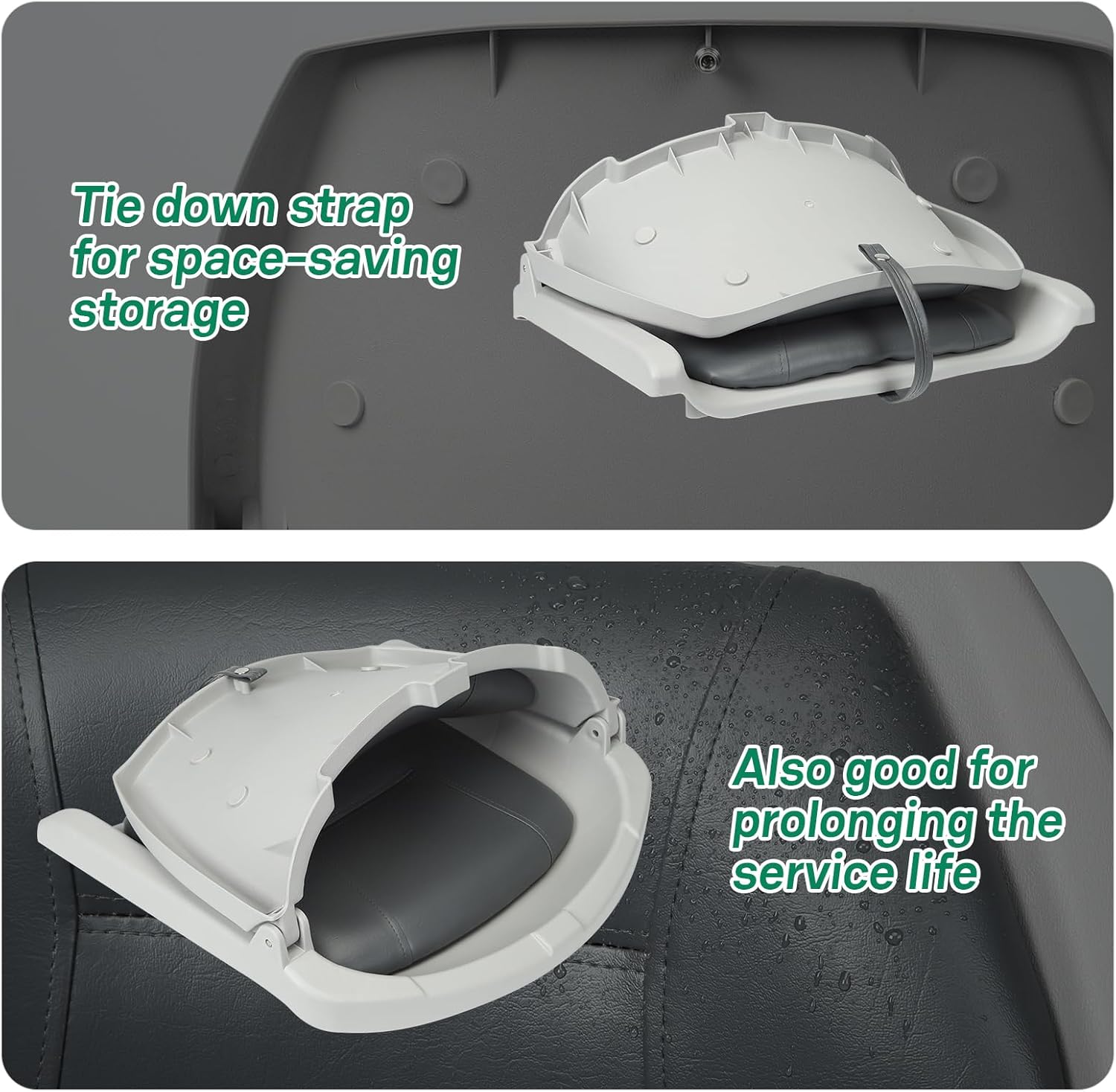 - Lightweight and Portable.Our plastic pontoon boat seat with backrest features a fold-down design and tie down strap, making it easy to store and transport. Whether you're on a small boat or a large vessel,this seat can be easily folded down and secured with the included hold-down strap, saving valuable space