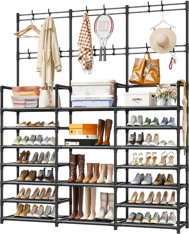 【Oszczędność miejsca i duża pojemność】73,5"W x 36"S x 11,5"G (wyższy i szerszy niż podobne produkty). Jest 8 haczyków na kurtki, kapelusze, torby, klucze, parasole i inne. Wieszak Raybee z 7 półkami jest zaprojektowany do przechowywania 24-36 par szpilek, butów, butów sportowych lub rzeczy na wynos. Pożegnaj się z bałaganem i powitaj uporządkowaną przestrzeń.