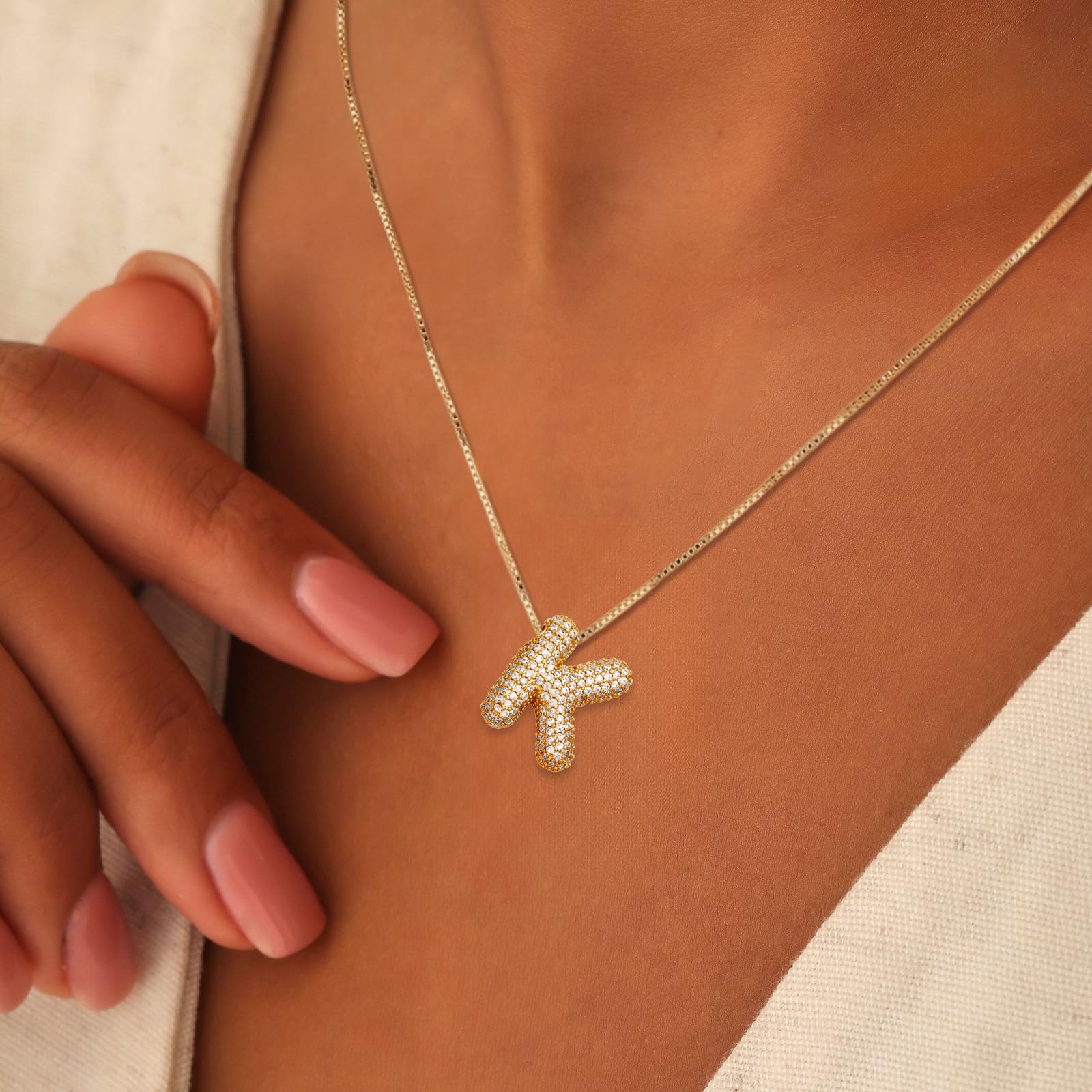 - BUBBLE LETTERS NECKLACE GOLD Plated- Stylish and trendy gold color letters necklace with sparkling Diamond, Gold plating is very durable necklace for women non tarnish, Rhinestone The rhinestones are beautifully set and won't fall out, letters design can be more beautiful and charming, It can be used with any necklace, making it a perfect complimented gifts , as well as a statement of personality and charm! Perfect for your everyday outfit