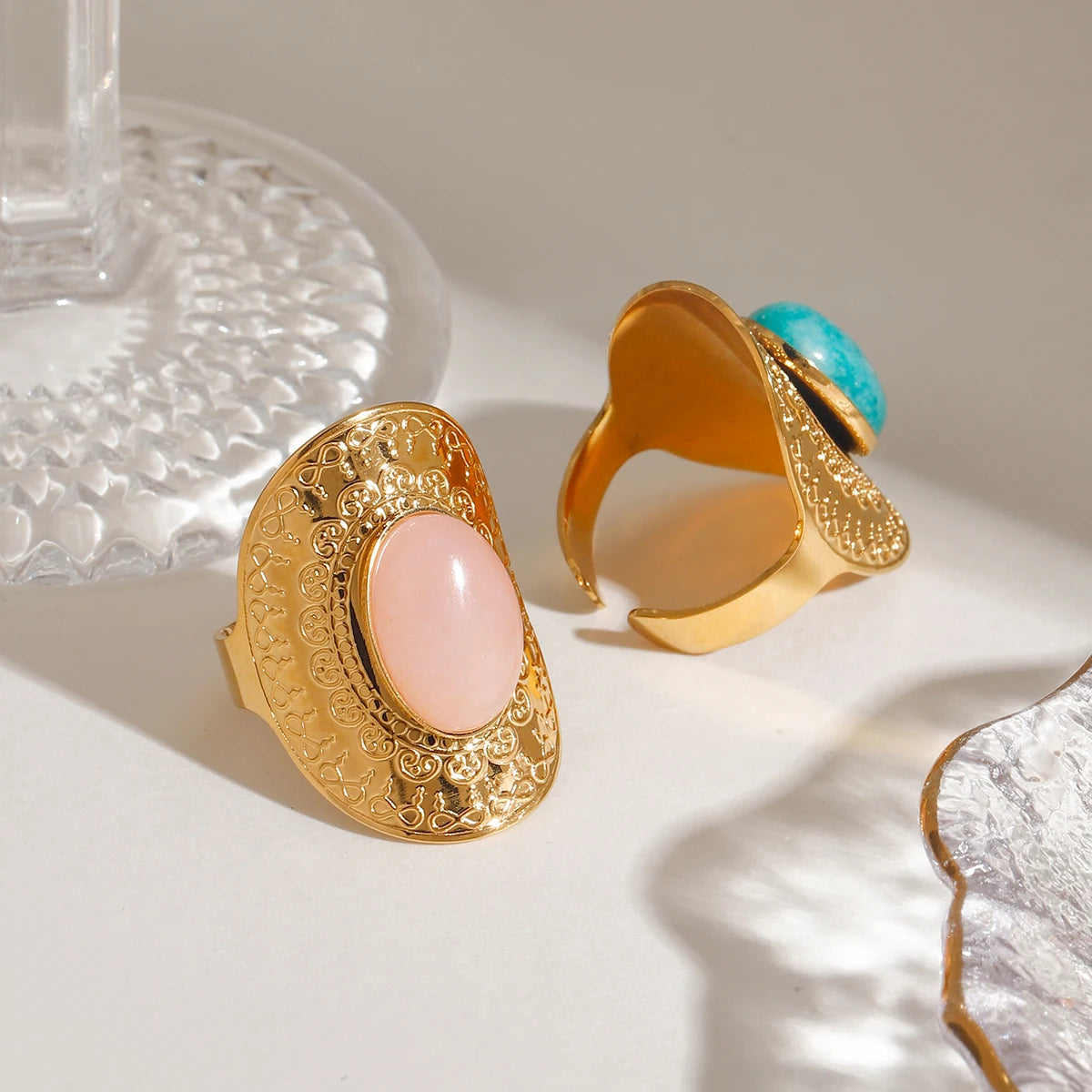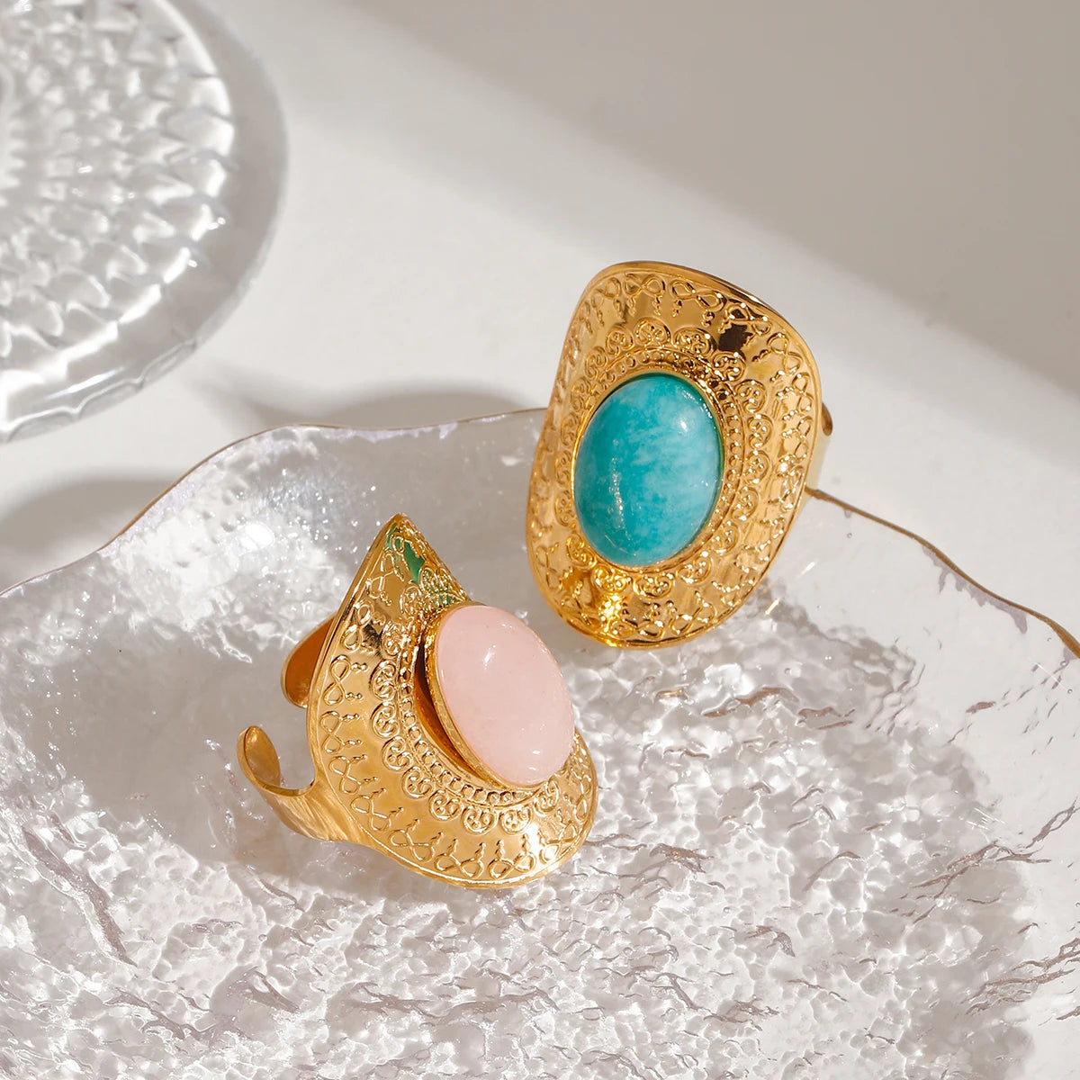 Vintage zielony różowy naturalny kamień stal nierdzewna otwarty pierścień wyrazisty masywny hiperboliczny pierścionek na palec modna biżuteria dla kobiet