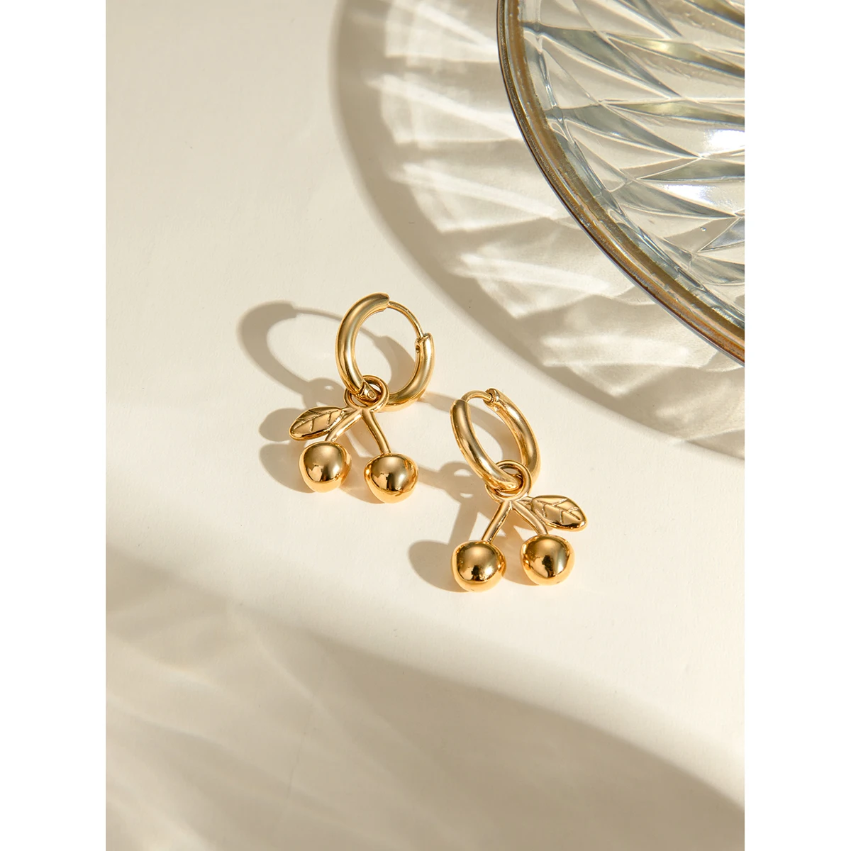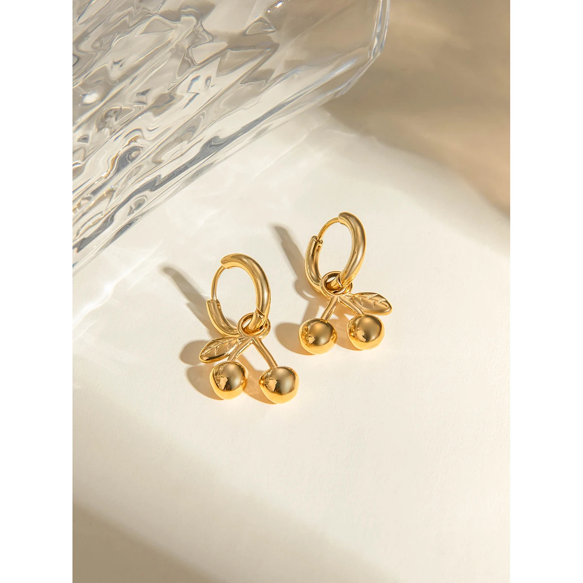 18K Gold Plated Stainless Steel Geometric Cherry Design Gold Color Pendant Earrings Delicate Temperament Fashion Jewelry Women