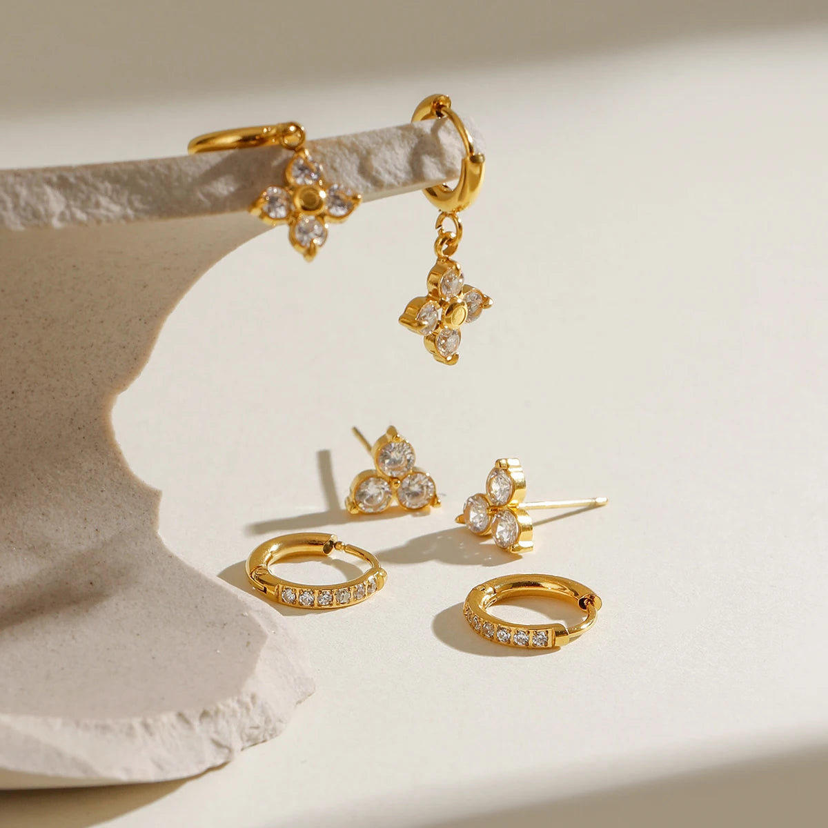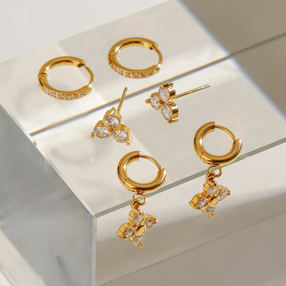 3 Pairs Per Card Stainless Steel White Zircon Four Pointed Star Earrings 18K PVD Plated Anti Allergic Rust Proof Jewelry