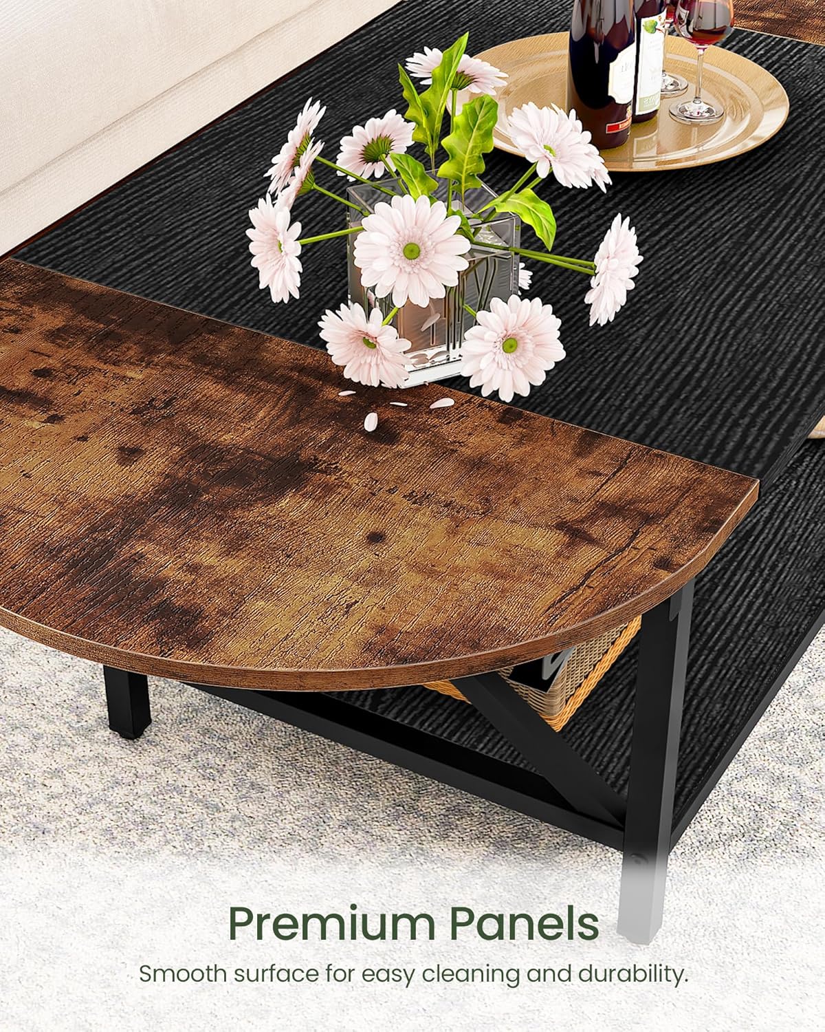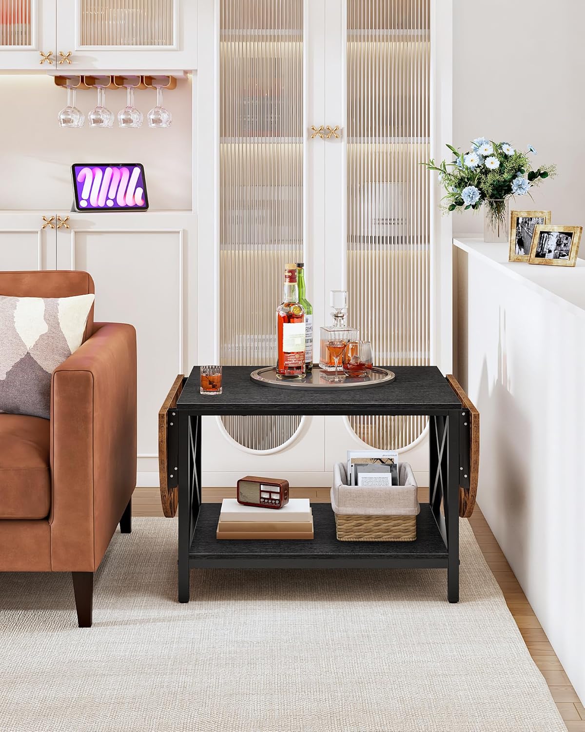 47.2" Folding Coffee Table, 2-Tier Extendable Coffee Table, Vintage Center Table with 2 Drop Leaves, with Storage Shelf, for Living Room, Bedroom, Balcony, Rustic Brown and Black TKF02BF