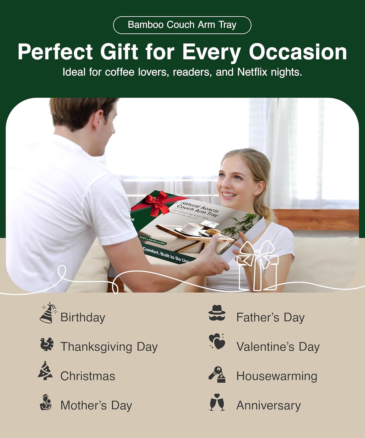 - 🎁Perfect Gift Choice: A thoughtful blend of comfort and function, our couch side arm tray makes an excellent gift for housewarmings or holidays. It fits most sofa arm styles (up to 8.8” wide)—including Track, Rolled, Slope, and Tuxedo Arms—making every couch session a joy, whether working, snacking, or unwinding with loved ones.