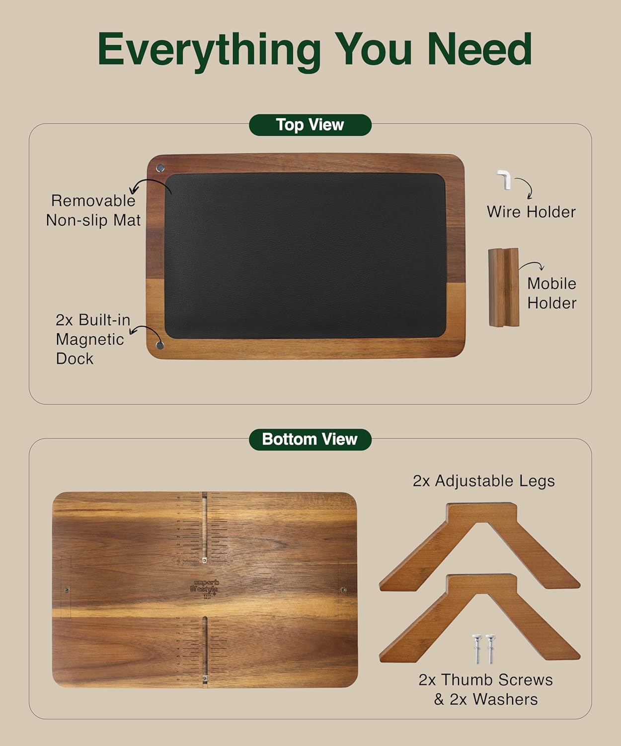 Acacia Couch Arm Tray/Mini Table – 2 in 1 Couch arm Table (15.3” x 9.8” x 4”), Adjustable Legs (up to 8.8”), 360° Rotating Phone Holder, Wire Holder, Non-Slip Mat – Couch Tray to Keep Snacks, Coffee