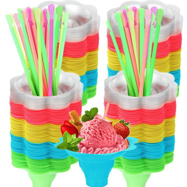 - PACKAGE CONTENTS:with 100 pack shaved ice flower cups in 5 colors, respectively transparent,yellow, pink, blue and green, 20 for each color, and 100 cone spoon straws with random colors, enough to meet your various party demands.