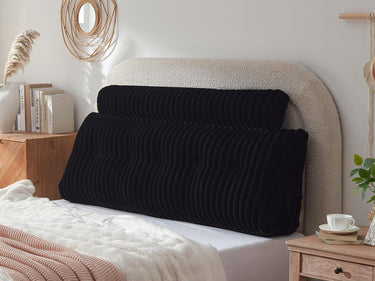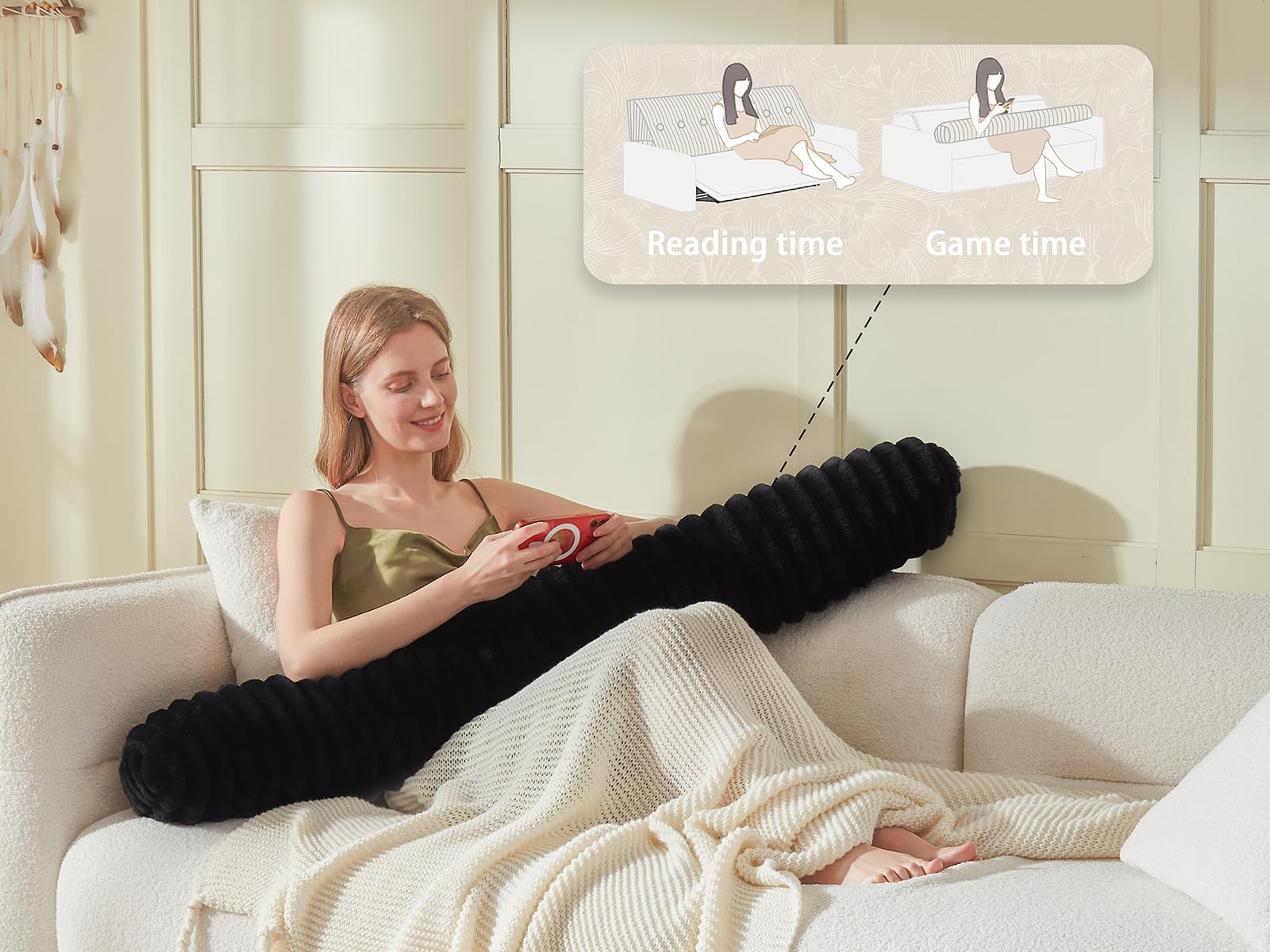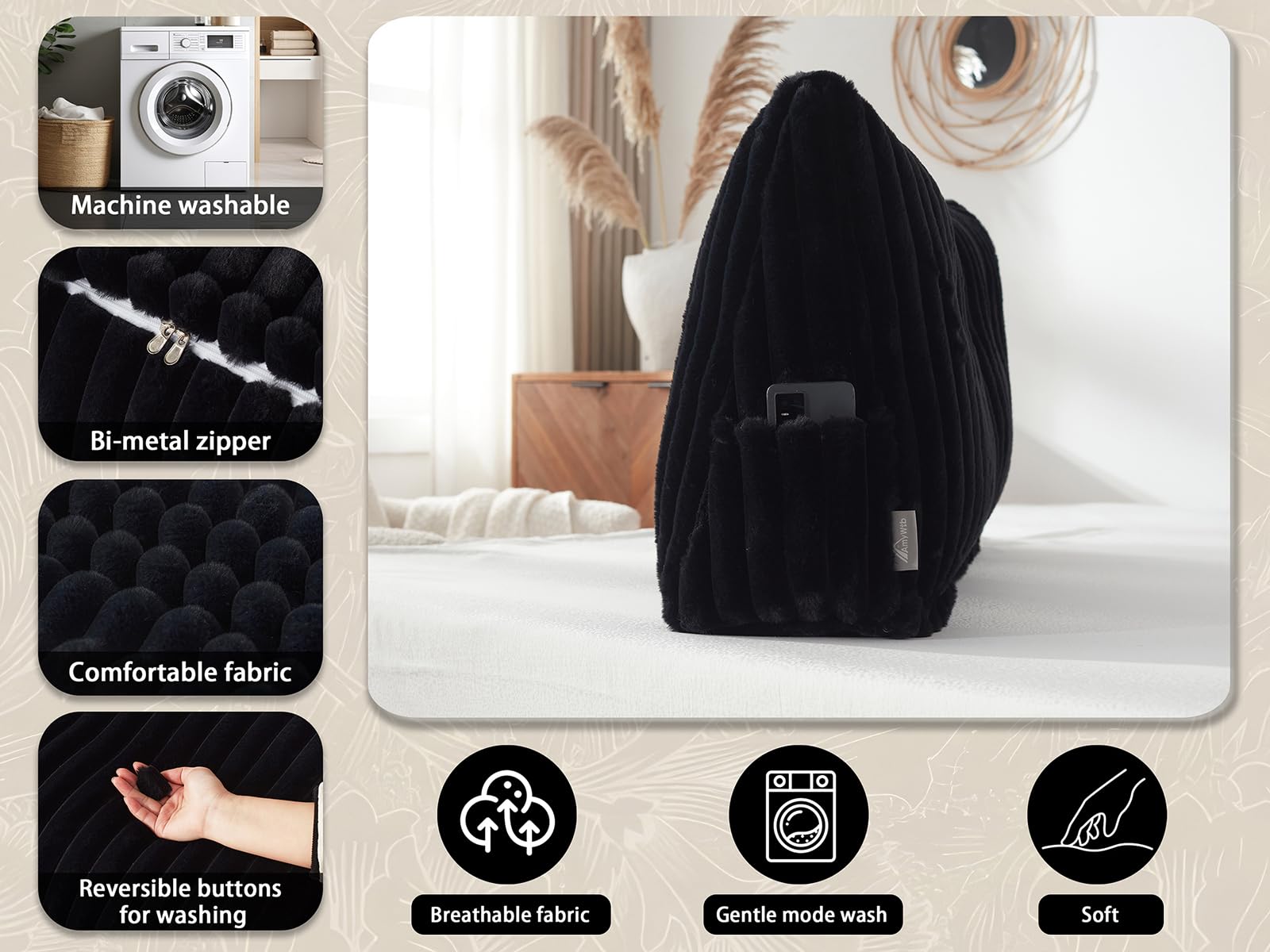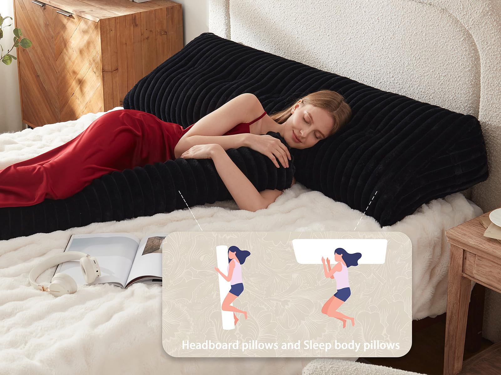 AmyWtb Headboard Pillow + A Long Neck Roll Pillow Body Pillow,Faux Fur Headboard Wedge Pillow with Removable Cover (Black, Queen:59x8x20 inches)