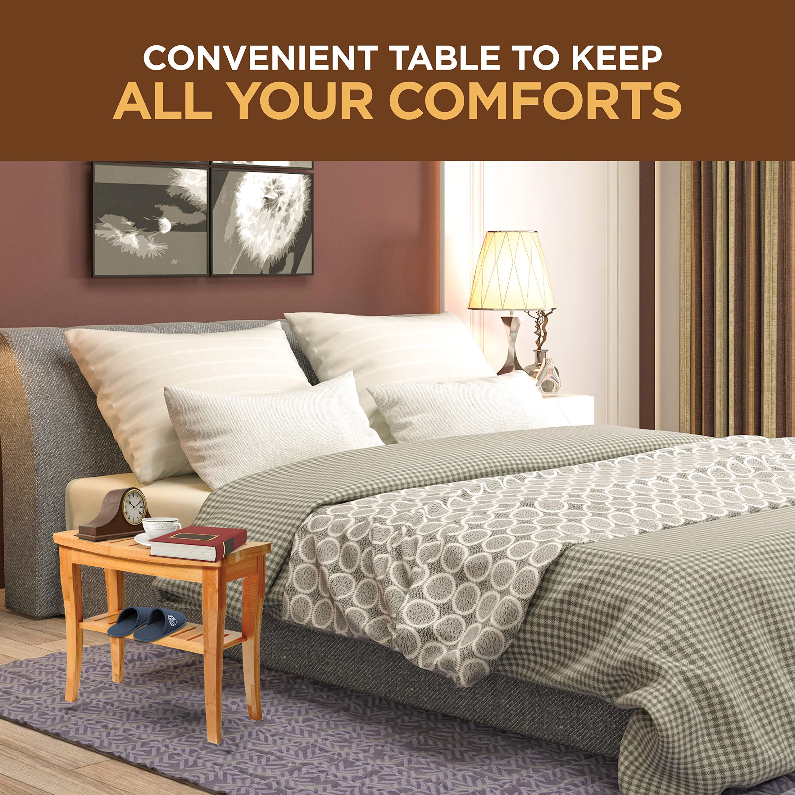 - BAMBOO SHOWER BENCH WITH STORAGE SHELF - This bamboo shower stool includes a convenient storage shelf to keep bathroom essentials like soap, shampoo, and towels within reach, making it an ideal shower bench for inside shower use. Its functionality makes it one of the most practical shower stools & benches for organizing spa decor items neatly.