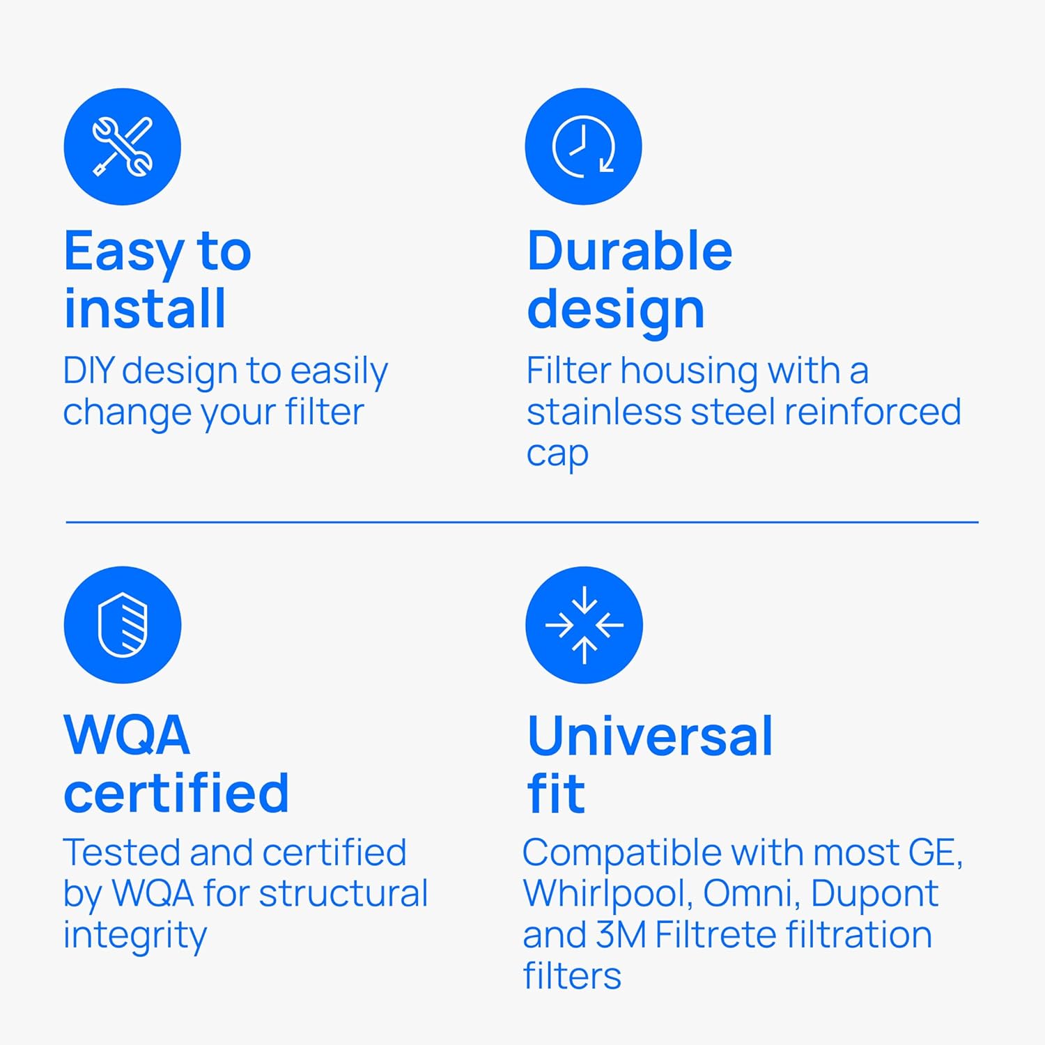 - Reliable, Certified Construction: Certified by WQA/CSA for low-lead compliance and NSF/ANSI standards for structural integrity and material safety. Durable, clear housing enables visual filter checks without disassembly.