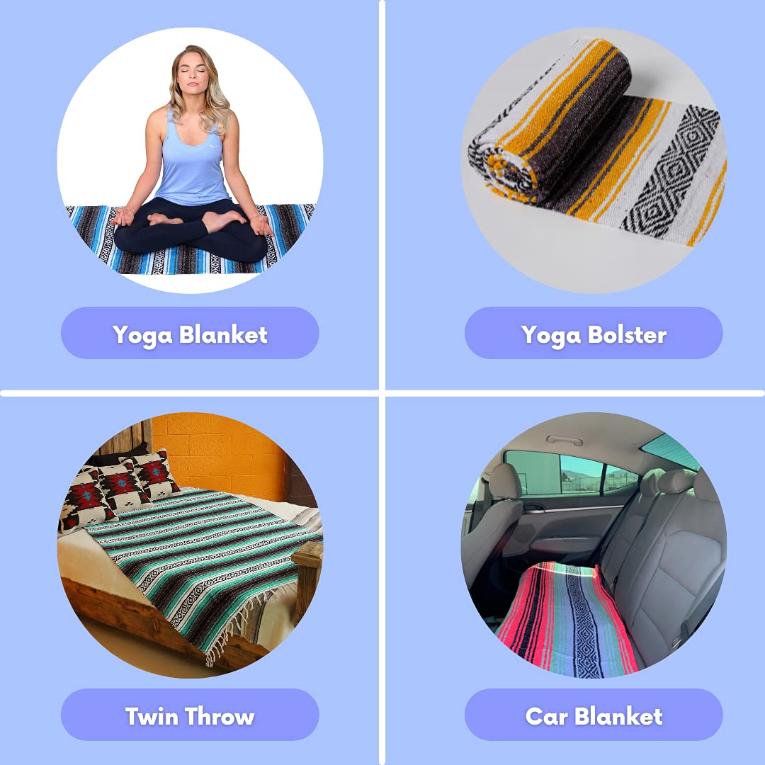 - MULTIPLE USES: Improve your yoga practice with our Falsa blanket for use over your yoga mat as a yoga blanket, yoga bolster, or meditation blanket. This blanket can be used indoors/outdoors and is ideal for the beach, camping, picnics, a twin bedspread, southwestern throw, accent throw, saddle blanket, home decor, car seat covers, or outdoor blanket.