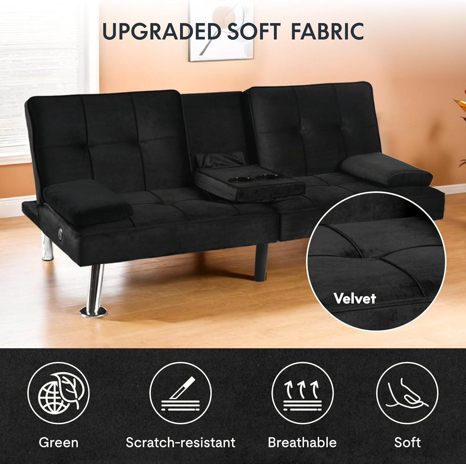 FLEXISPOT XCT3 Futon Sofa Bed with USB & Type-C Charging Port, Convertible Sleeper Couch with Adjustable Backrest, Folding Loveseat for Small Space, Living Room, Guest Room, Apartment (Velvet, Black)