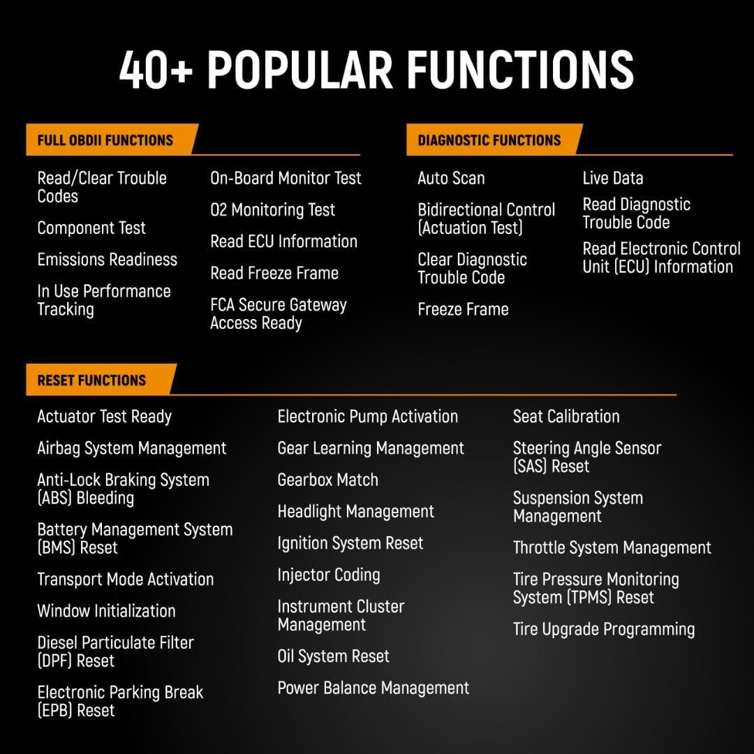 - Supports 23 vehicle reset/relearn functions, including throttle matching, ABS bleeding, TPMS reset, etc.