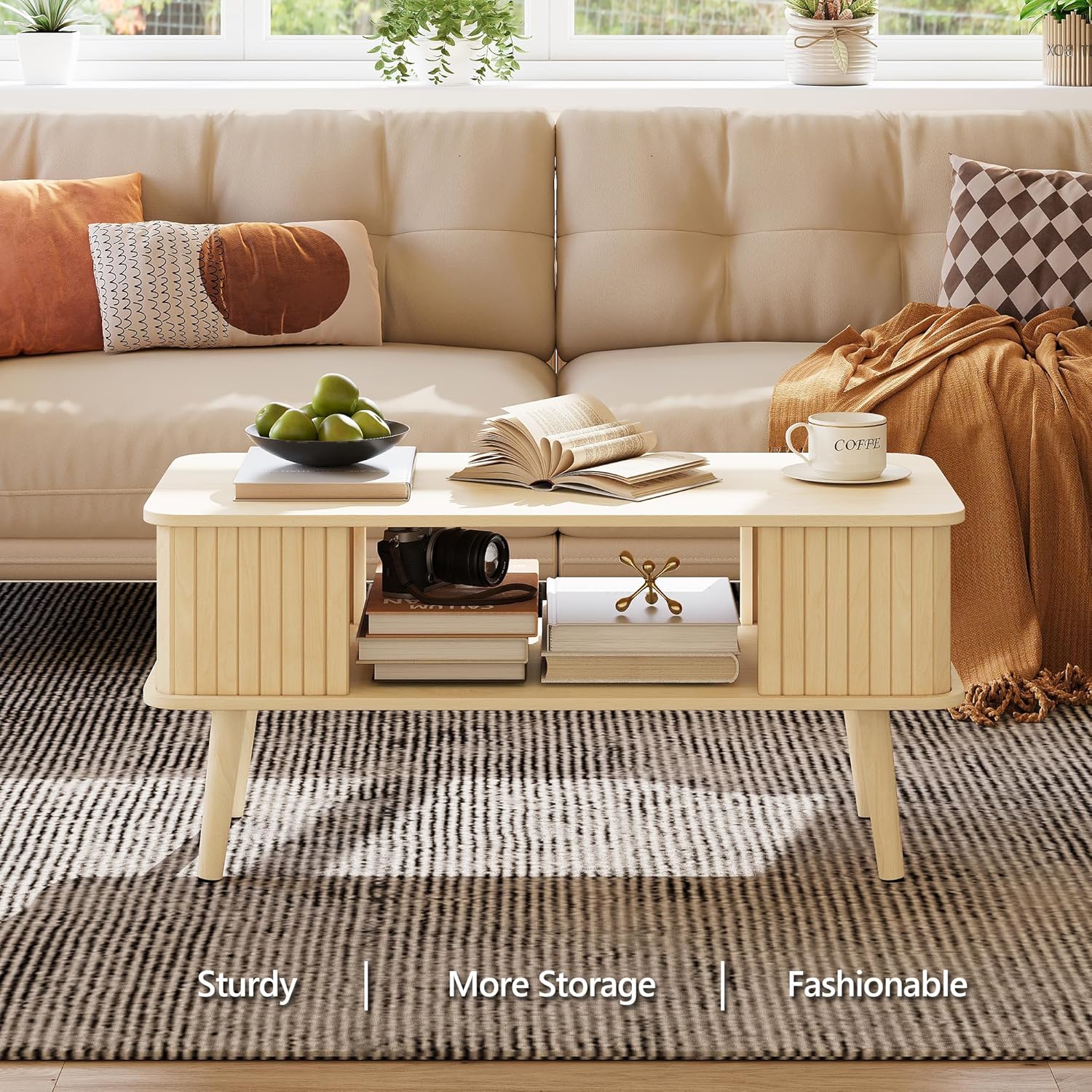 - 【Minimalist Design with Natural Warmth】Designed in a clean minimalist style, this center table for living room pairs a natural wood surface with sleek lines for a fresh and inviting look. The semi-enclosed slat panel detail on the lower tier adds texture and character, making it blend easily with both modern and casual interiors.Also combined with smooth, rounded edges for safety and modern style.
