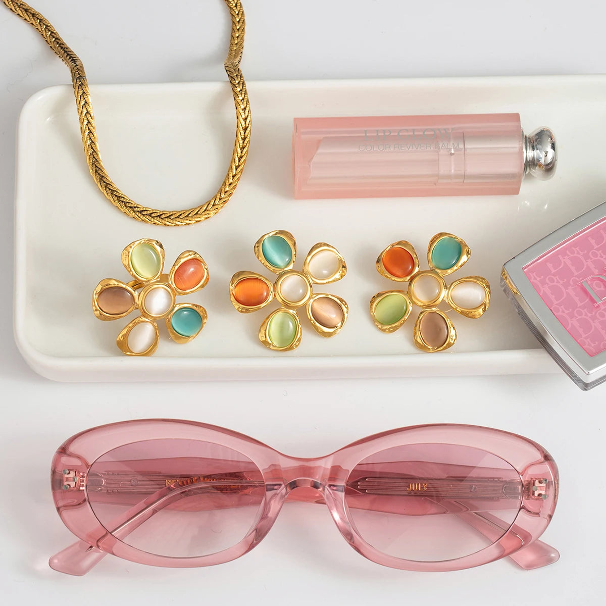 Minimalist 18k Gold Plated Stainless Steel Colorful Cat Eye Stone Hammer Flower Earrings Ring Women Anti Allergic Charm Jewelry