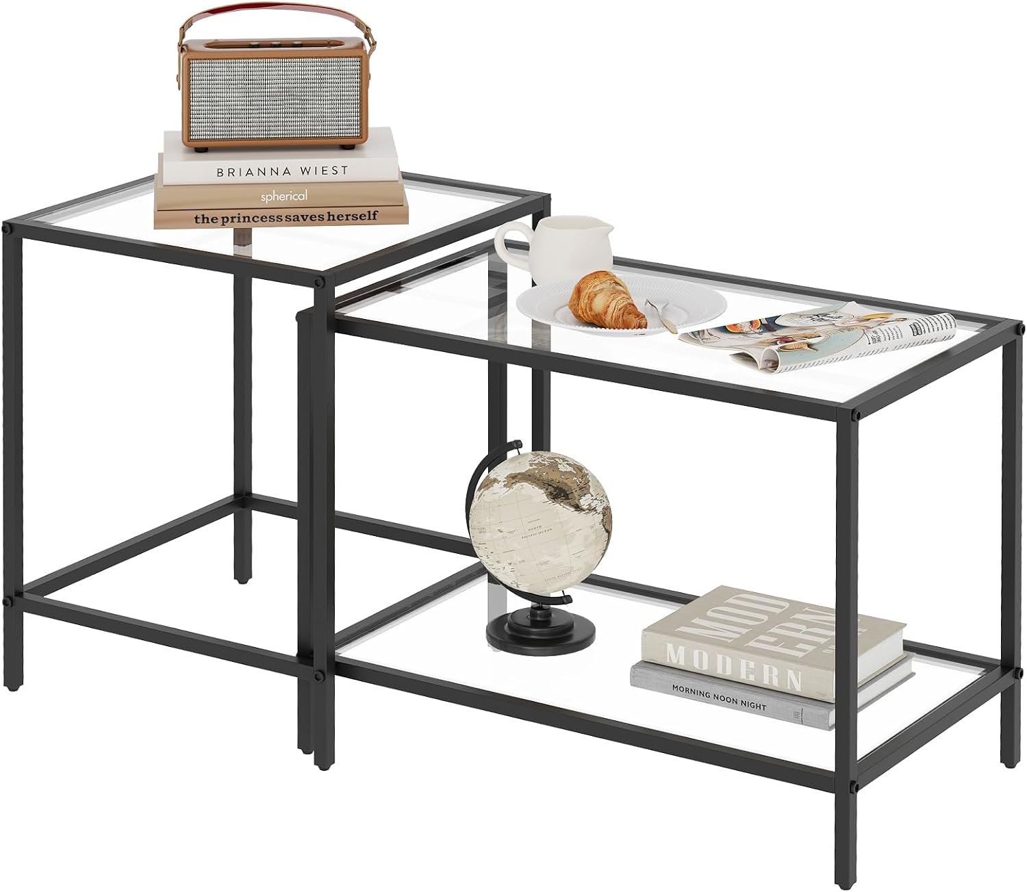 Nesting Coffee Table Set of 2,Glass Coffee Table Modern Center Living Room Table,Minimalist Nesting Table Set of 2 for Living Room,Tempered Glass-top with Sturdy Metal Frame, Easy Assembly,Black