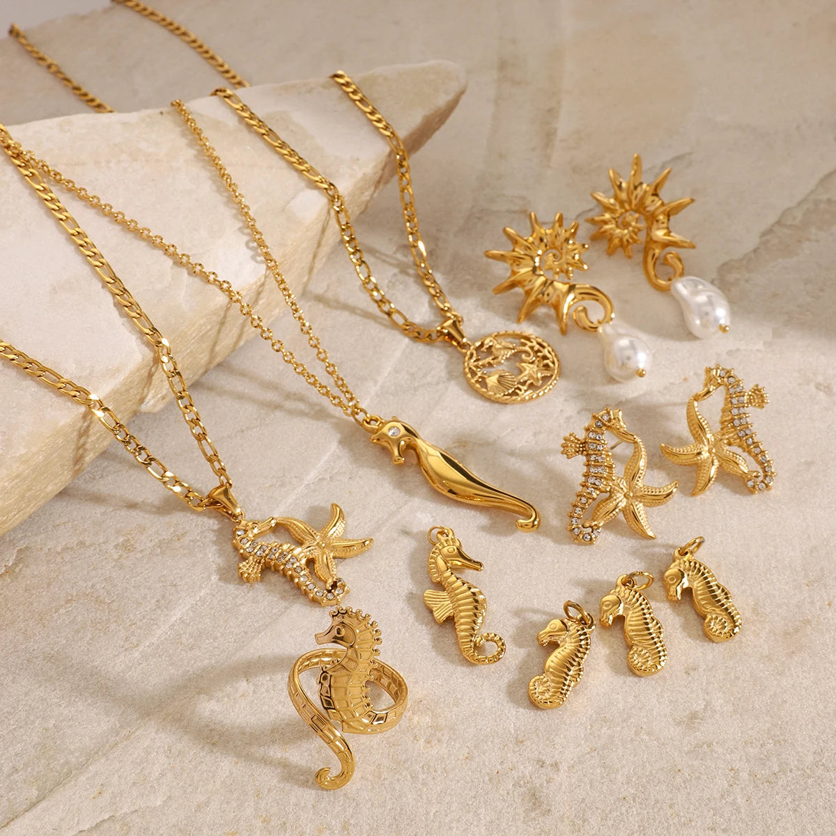 Trendy 18k Stainless Steel Seahorse Shape Ring Necklace Earrings Women Statement Charm Texture Rust Proof Trendy Jewelry Gift