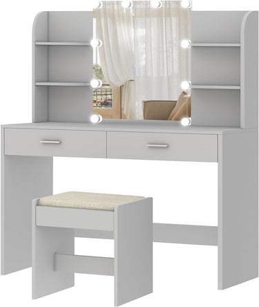 This is a practical vanity set with great storage capacity and meanwhile help you complete the best makeup effect. The large mirror & 10 led bulbs with 3-color lighting modes & brightness adjustable are the secret to your beauty! Fine selection of high-definition makeup mirror, easier to view your makeup details.The 2 drawers, 6 storage shelves and the roomy desktop provides ample space your creams, lip glosses, lipsticks, brushes & etc, allowing all of your beauty supplies tidy in this vanity