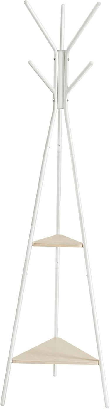 [What You Get] A stylish coat rack stand with 6 smooth hooks and 2 triangular storage shelves, an accessory bag, and easy-to-follow instructions—bring your home an organized and stylish look