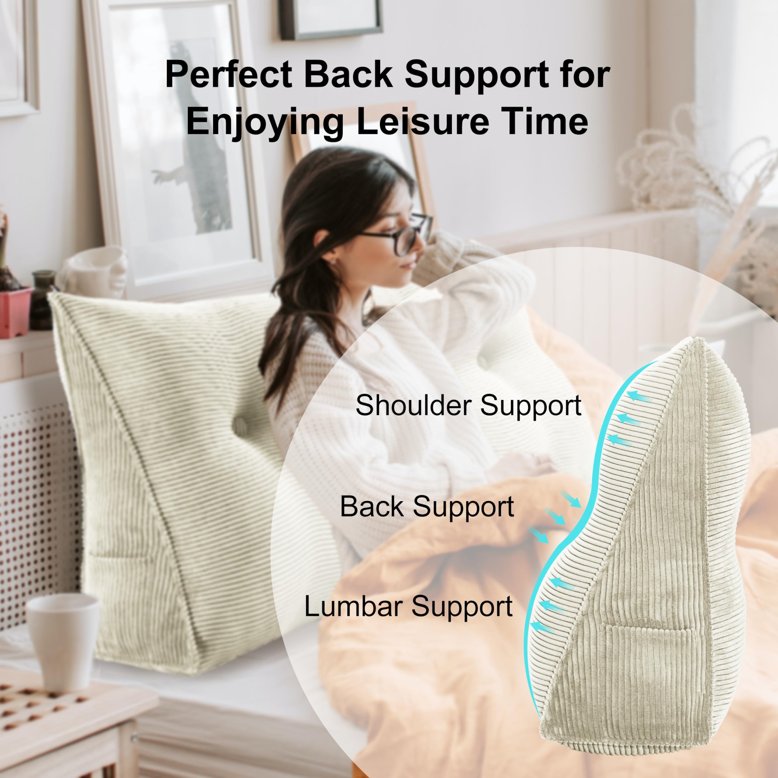 WOWMAX Wedge Pillow Headboard Queen Triangular Headboard Pillow Queen Bed Wedge Pillow for Headboard Bolster Pillow for Bed Daybed Pillows with Removable Cover, Corduroy(100% Cotton), White