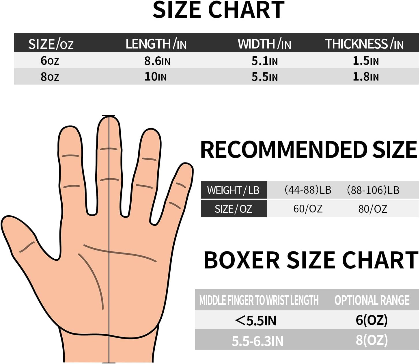 - 【Matching Your Hand Size】Boxing gloves set for kids,boys, girls, junior, youth, Glove Size 6oz: Recommended Age 5-9, Weight 45 – 80 lbs. Glove Size 8oz: Recommended Age 8-12, Weight 80-105 lbs. Glove Size 10oz: Recommended Age 11-15, Weight 100-125 lbs.