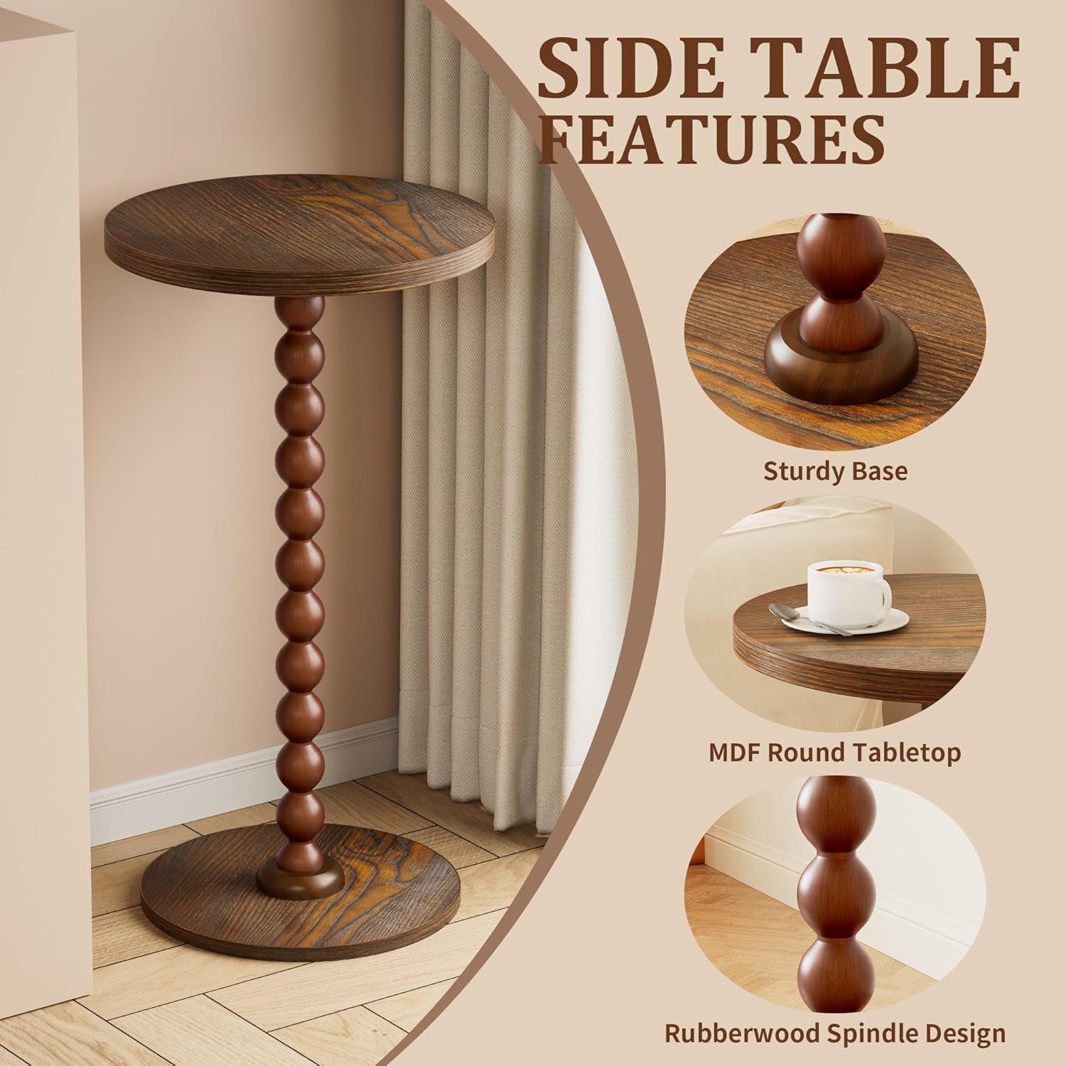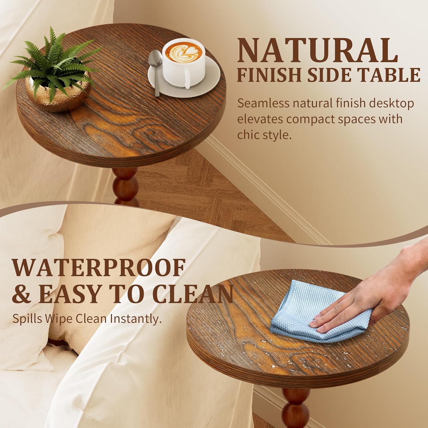 Round Side Table, Drink Table for Small Spaces, Modern Accent Nightstand with Rubberwood Leg for Living Room, Bedroom, Corners, and Office (Brown)