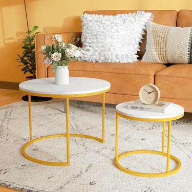Round Nesting Coffee Tables Set: White Gold Marble Nesting Coffee Table Set of 2 - Modern Metal Stacking Side Table for Living Room Small Spaces