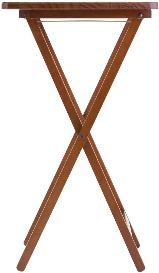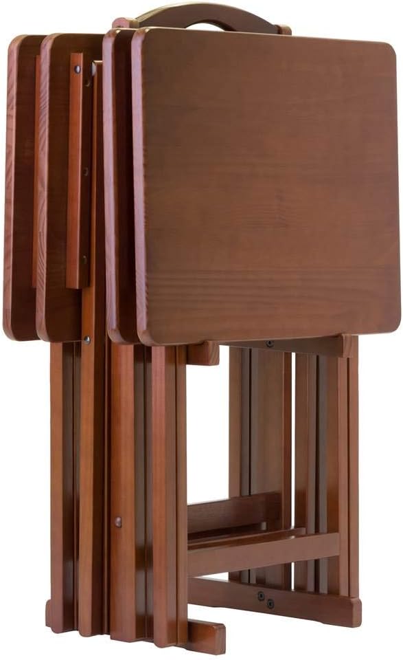 Make entertaining simple and easy with the Alex 5-Piece Snack Table Set. Constructed of Solid Wood, this stylish set includes four foldable tables with X-frame bases and a convenient storage stand. The tables have gently curved sides and rounded corners and are ideal for setting out appetizers at the big game or for grabbing a meal while relaxing on the sofa. Finished in a rich Walnut that brings out the natural wood grain. Tables fold in an instant for easy storage. Individual Table Size: 19"W x 14.5"D x 25.9"H (open) Dimensions of Stand with tables stored: 19"W x 10.4"D x 30.8"H Static Maximum Weight per Table: 25 lbs. Rack dimension: 12.3"W x 10.4"D x 30.8"H Tables come fully assembled Storage Stand requires assembly Ships in 1 box