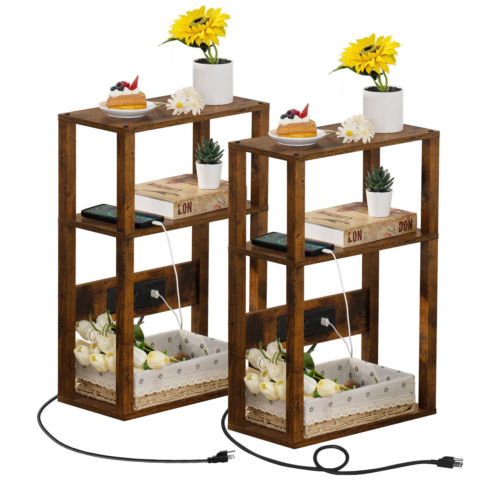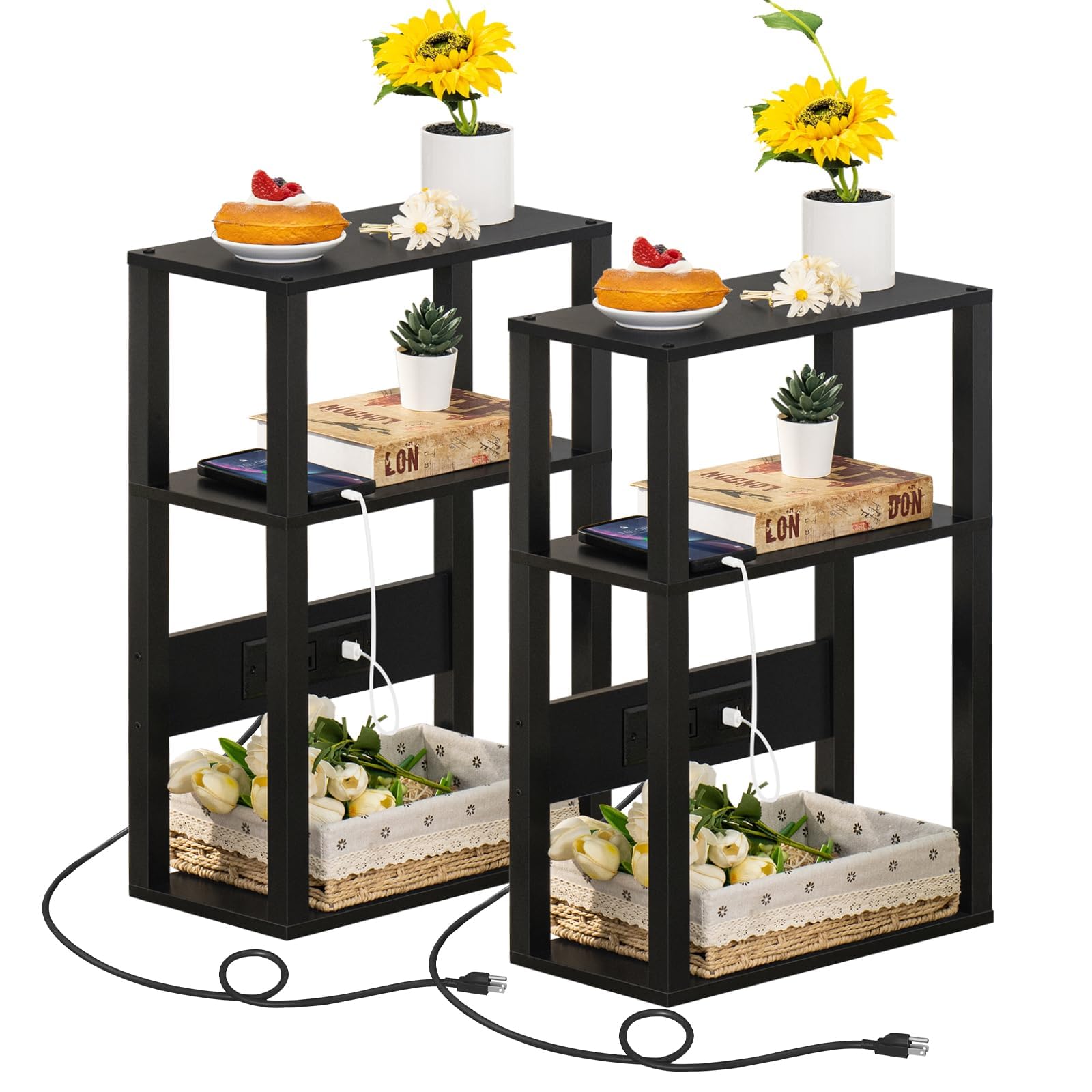 - Space-saving 3 Tier Storage: 15.75"D x 7.87"W x 23.62"H, this skinny side table with charging station is perfect for small spaces as a sofa end table, night stand and bed side Table placed in corners and small spaces, the side table is not very spacious but still has enough room to add a table lamp on the top panel, photo frames, coffee and magazines where you can enjoy a short relaxation with a cup of coffee or tea, and a middle and lower tier to help you organize more essentials.