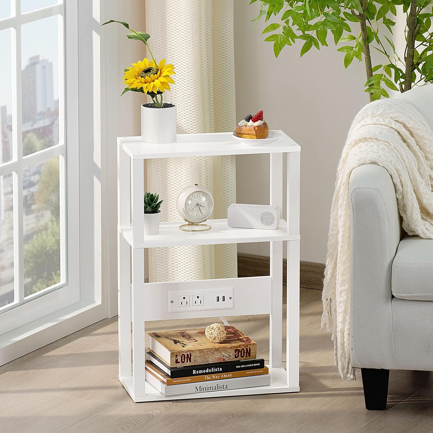 3-Tier Small Narrow Wood Side Table with Charging Station, Skinny Nightstand for Small Space, Slim Bedside Table with Storage for Couch, Thin End Table with USB Ports and Outlets, White