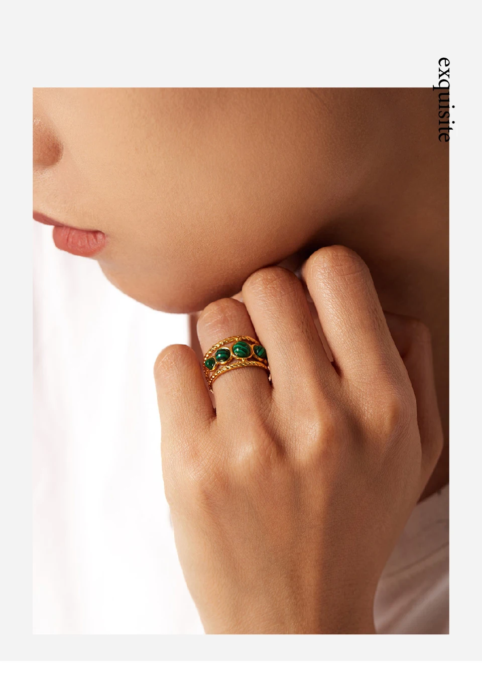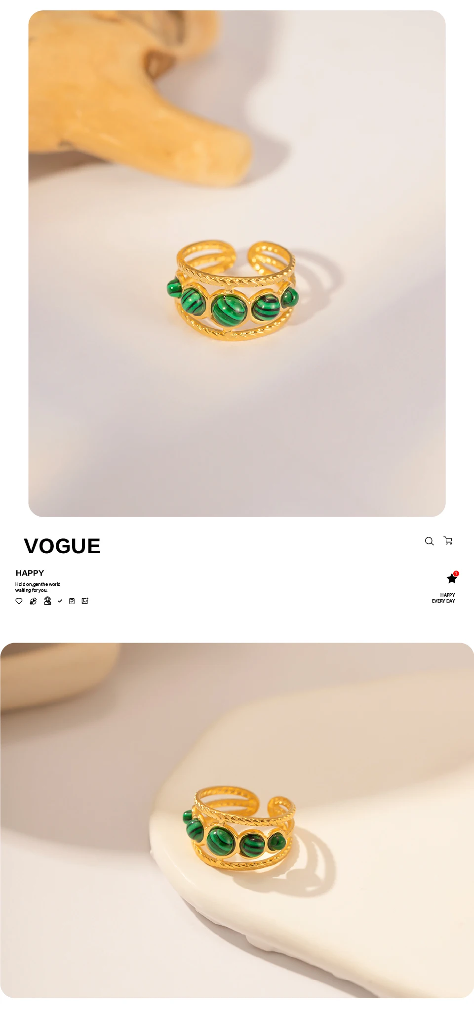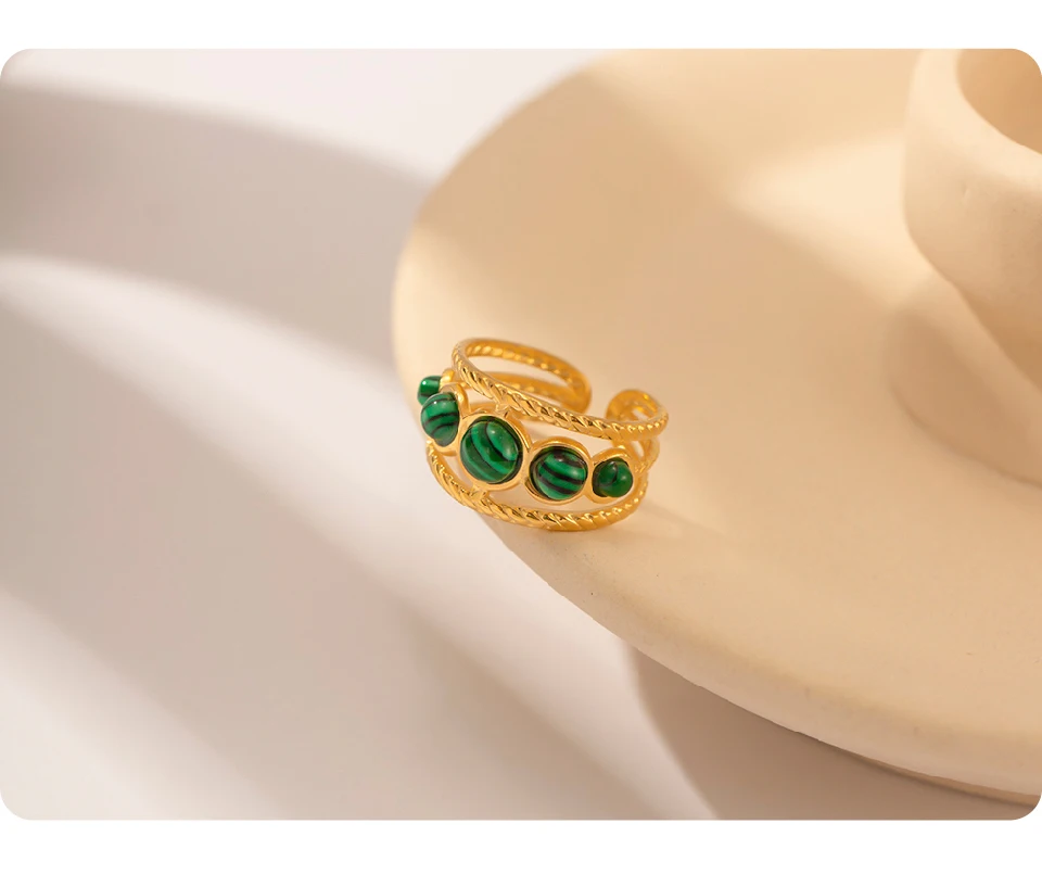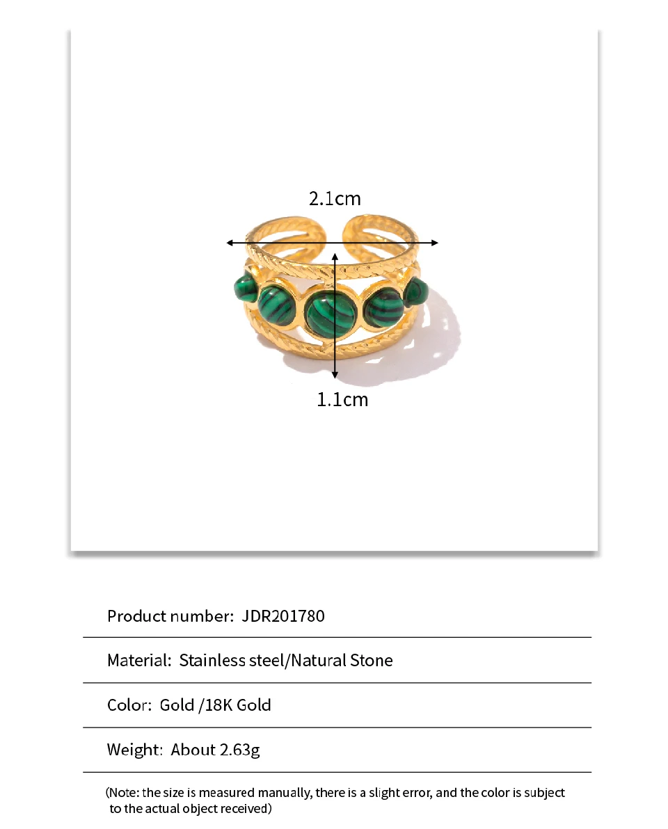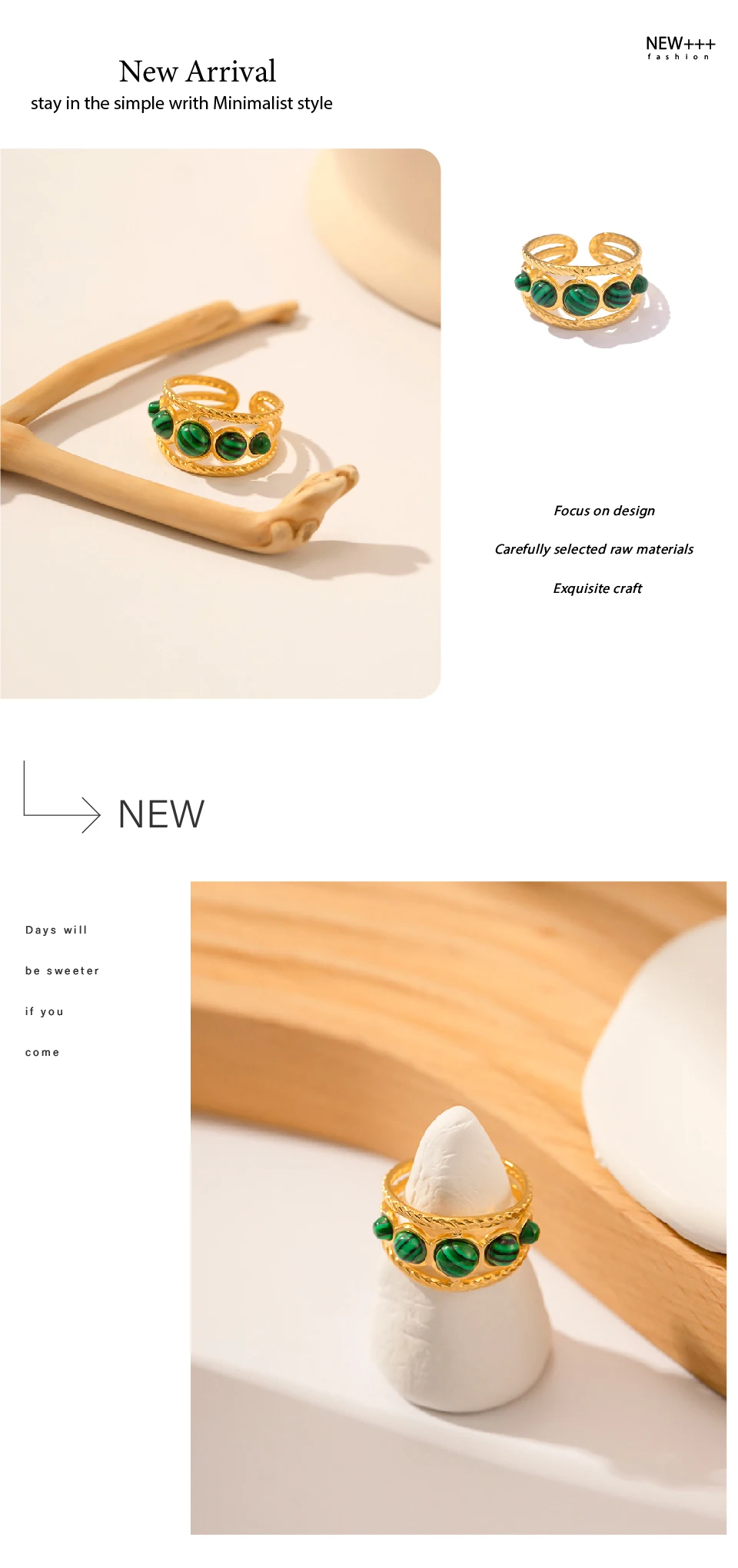 Anéis ajustáveis ocos à prova d'água em aço inoxidável banhado a ouro PVD com pedra natural de malaquita