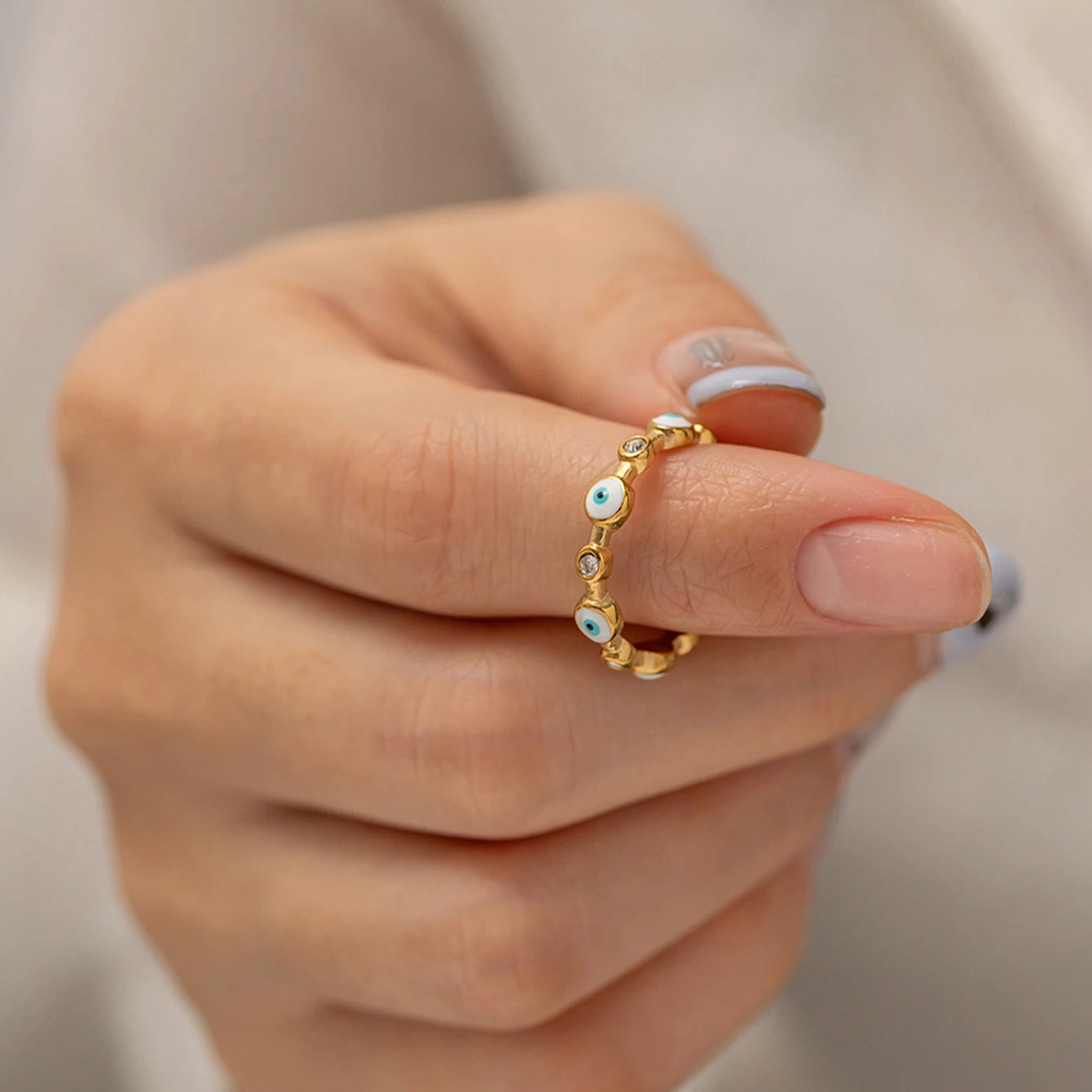 Anel de Moda com Design Olho do Diabo em Aço Inoxidável Delicado com Brilho 2024, Textura Cor Dourada, Tendência de Joias para Mulheres