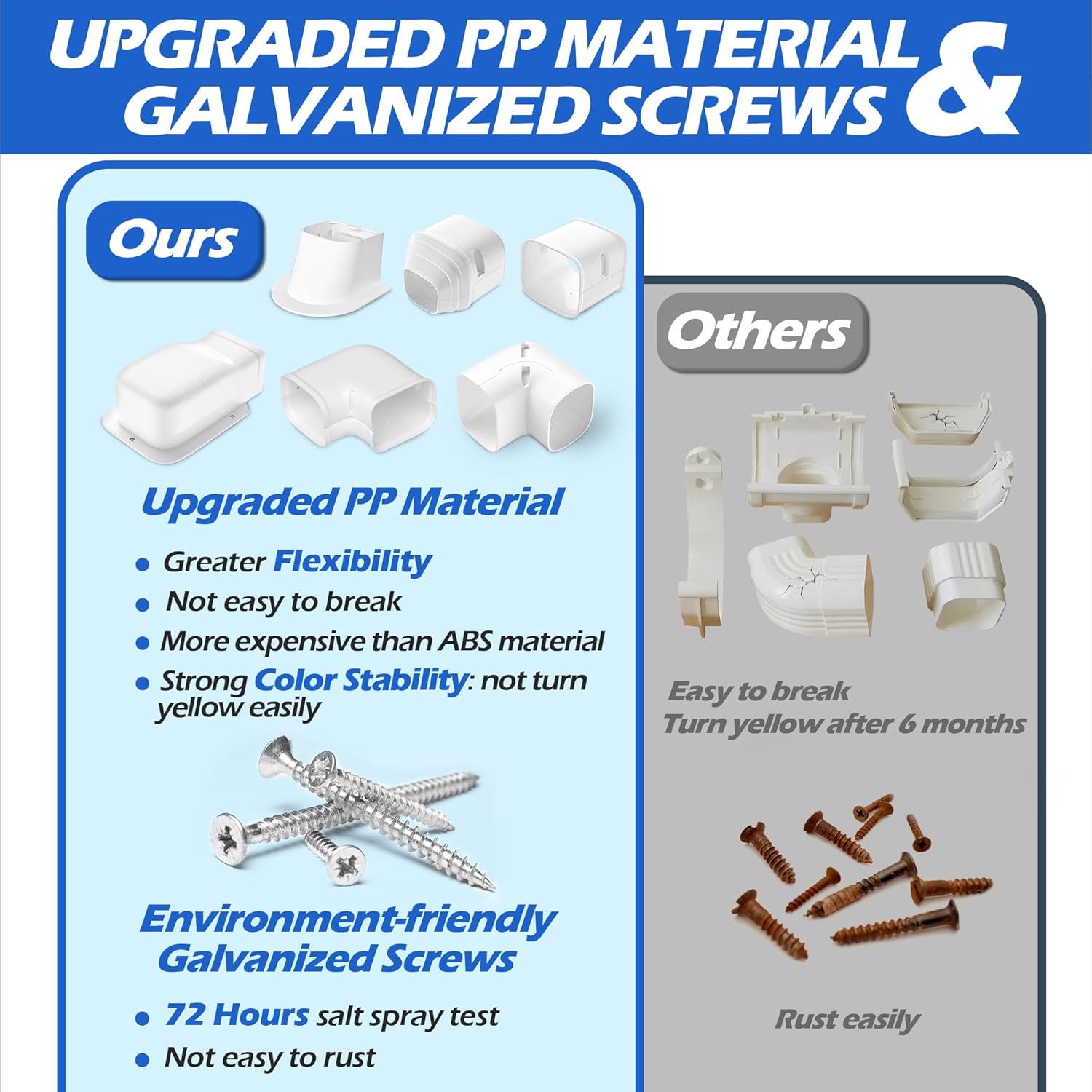 - Great Value Set 3’’*17 Feet- This line cover set is totally sized with 3’’*17 feet, including 4*3.3 feet straight ducts+2*2 feet flexible ducts, longer than similar products in the market. This PVC line set also includes most integrated parts, more parts than others. With our combination, no need to buy other parts separately.