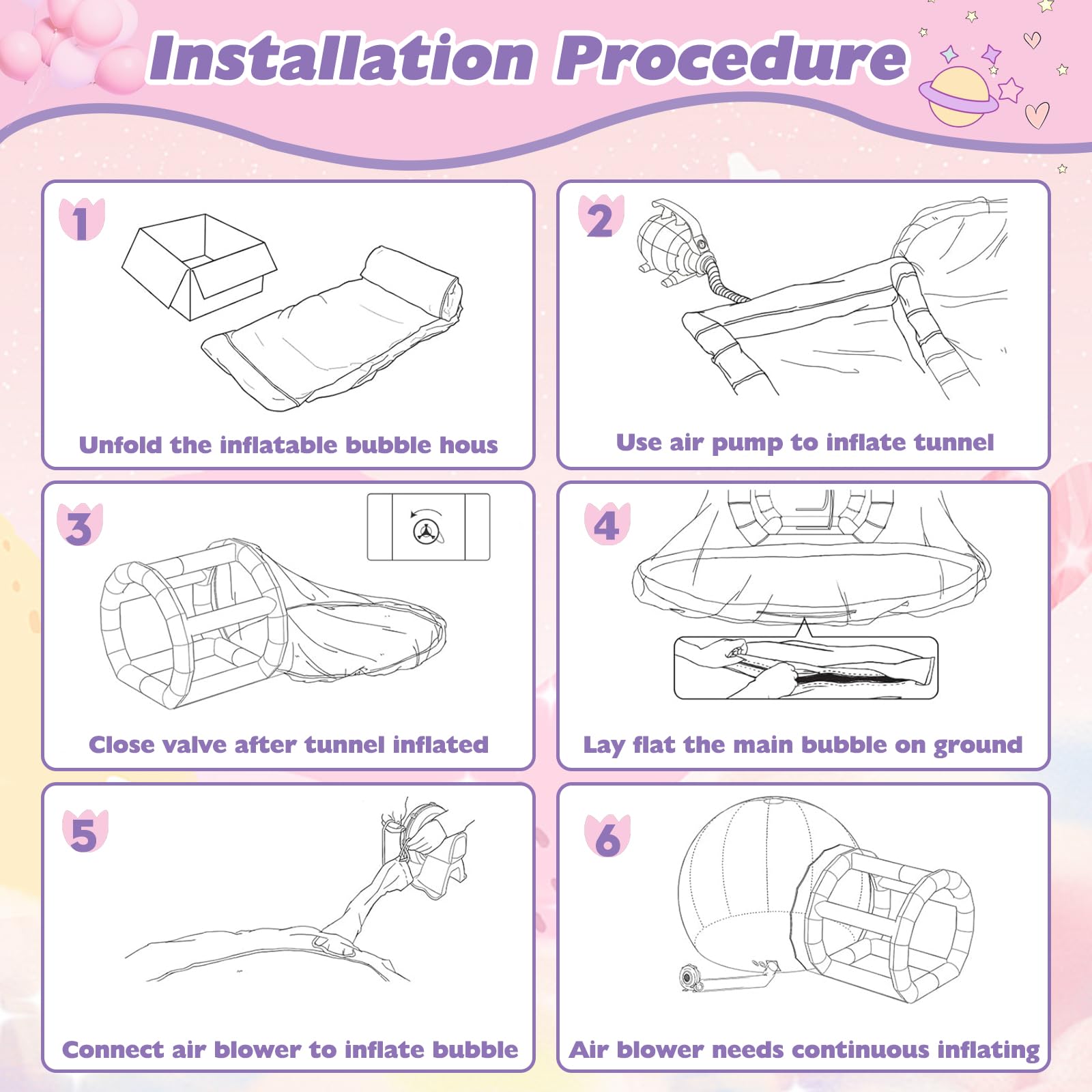 - Quick and Simple Assembly: Setting up the inflatable dome is a breeze. Just connect the provided air blower, inflate in minutes, secure the vent, and position it as desired. This bubble house is ready for fun and games in just five minutes, and it stays inflated as long as it's plugged in.
