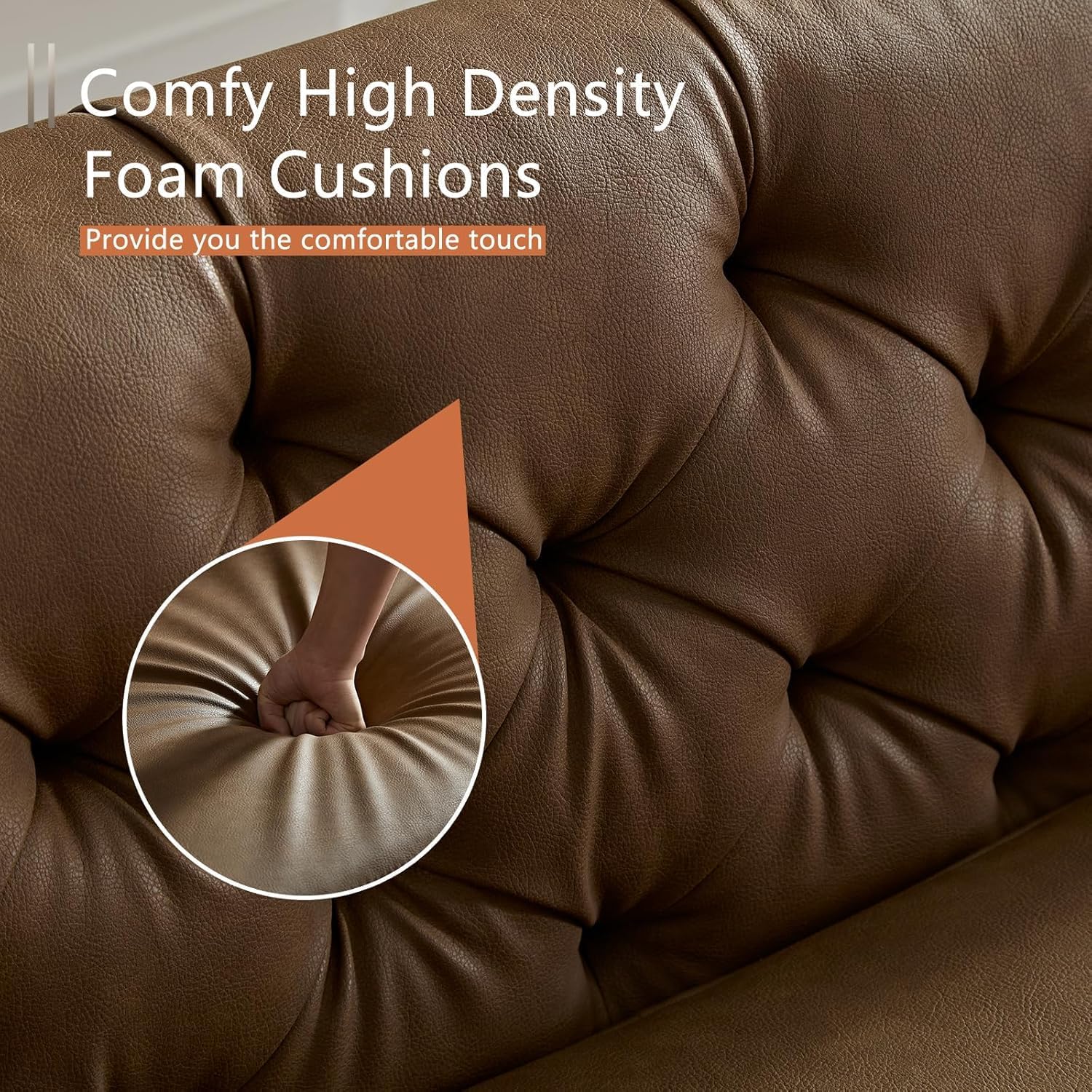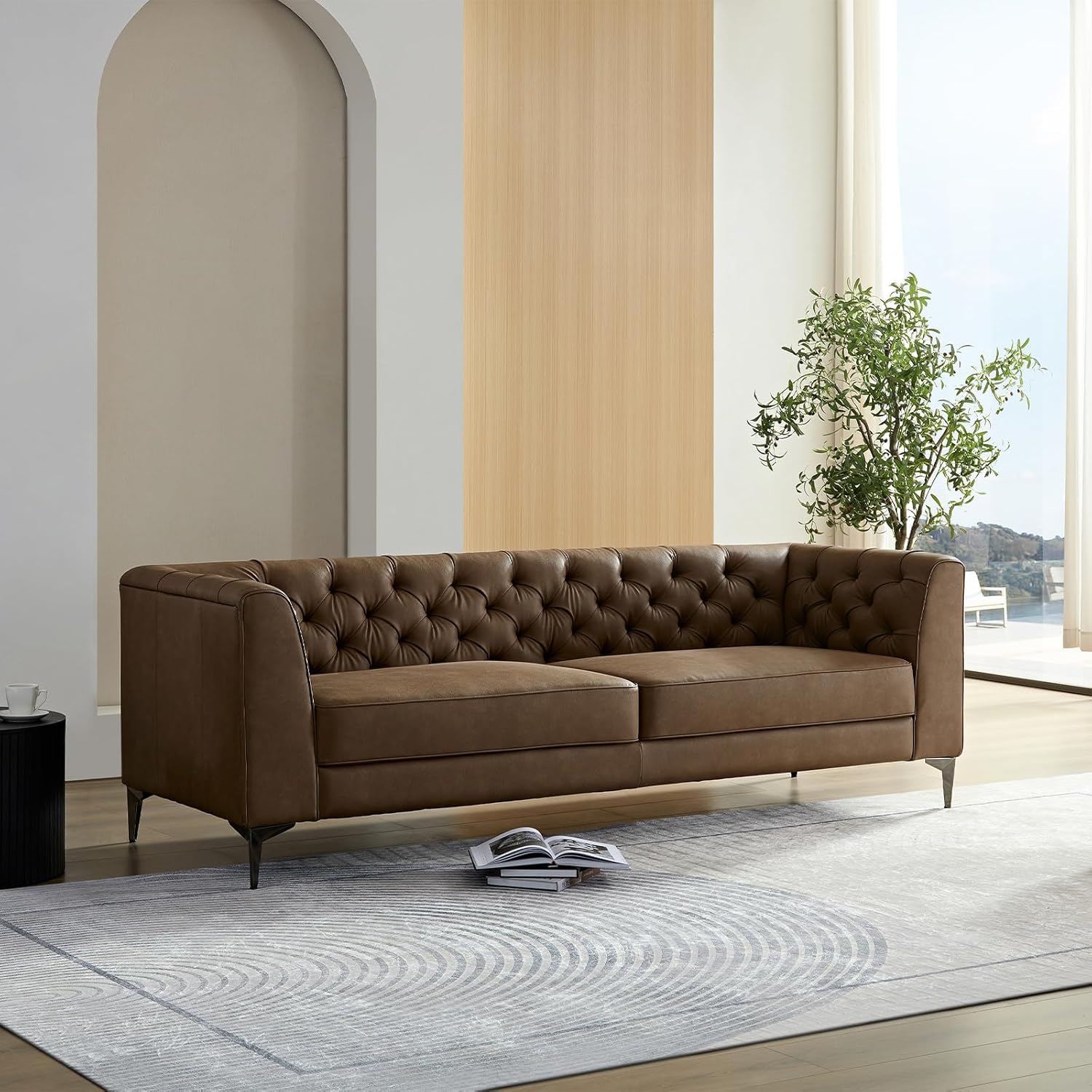 90.5" Mid-Century Modern Sofa Leather Couch, 3-Seater Tuxedo Tufted Couch, Vintage Luxury Chesterfield Sofas with Metal Legs, Modern Upholstered Couches for Living Room, Apartment, Office, Brown