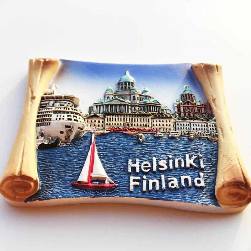 Feita com resina e ímãs de alta qualidade, cada peça é uma obra de arte única que captura a essência dos marcos icônicos e das paisagens cênicas de Helsinque.