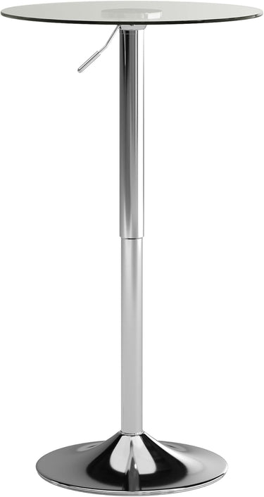 Elevate the seating space at your next event or get together with the Flash Furniture Chad Round Glass Cocktail Table. Comfortably seating up to 2 adults, this adjustable banquet table is a must have for DIY and professional decorators hosting events. It also offers an exciting way to enjoy a meal at home if a standard height dining table doesn't cut it for you. The table's height can be easily adjusted with the pneumatic lever under the top, and the base is fitted with a plastic ring to help protect your floors from being scratched. Boasting an 8 mm. thick tempered glass swivel tabletop, this elegant cocktail table can be left as is for a casual vibe or decorated with long linens and a sash for more formal occasions. The round chrome base stays out of the way when guests and socializing while enhancing any room with a contemporary chic design. This round cocktail table measures 23.5" W x 23.5" D x 33.5-41" H to comfortably seat up to 2 adults, making it great for rental businesses, banquet halls, restaurants, or home use.
