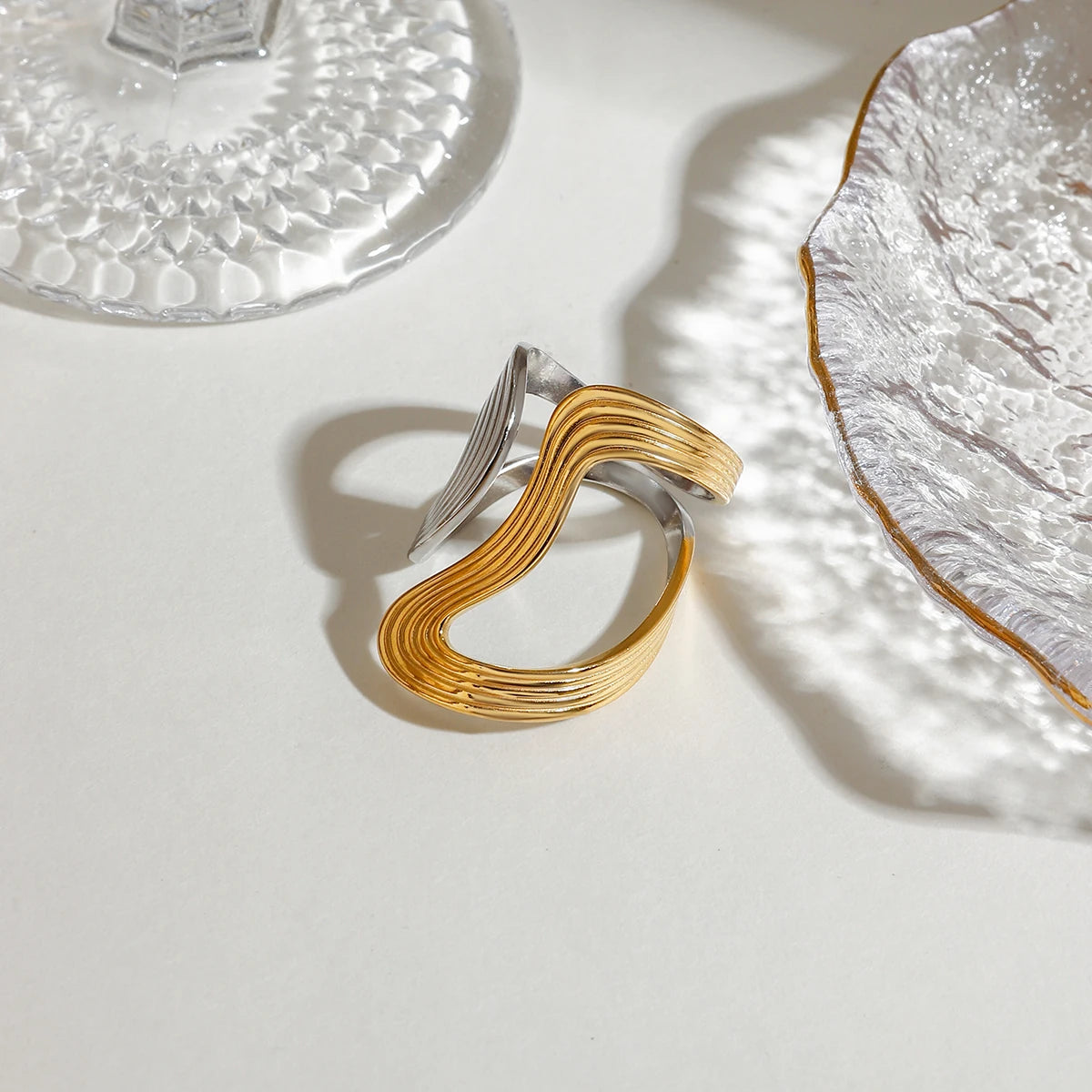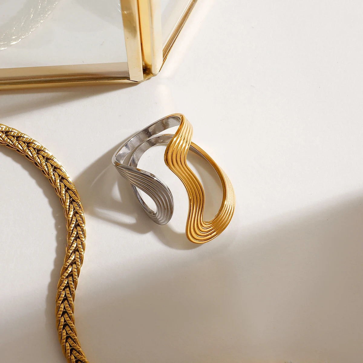 Anel Aberto Irregular com Fio de Correspondência em Cor Ouro Prata, Revestido em PVD 18K, Feminino, Antialérgico, Pingente de Metal, Joia para o Dia a Dia