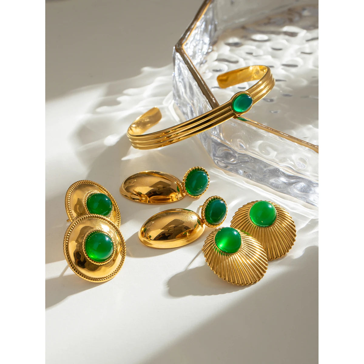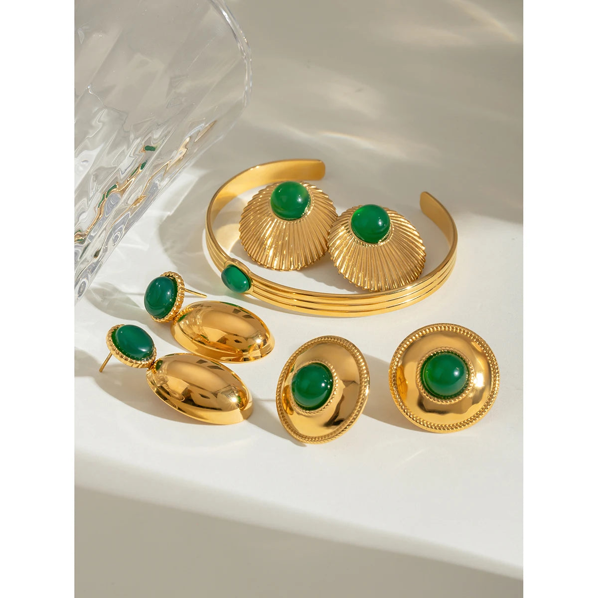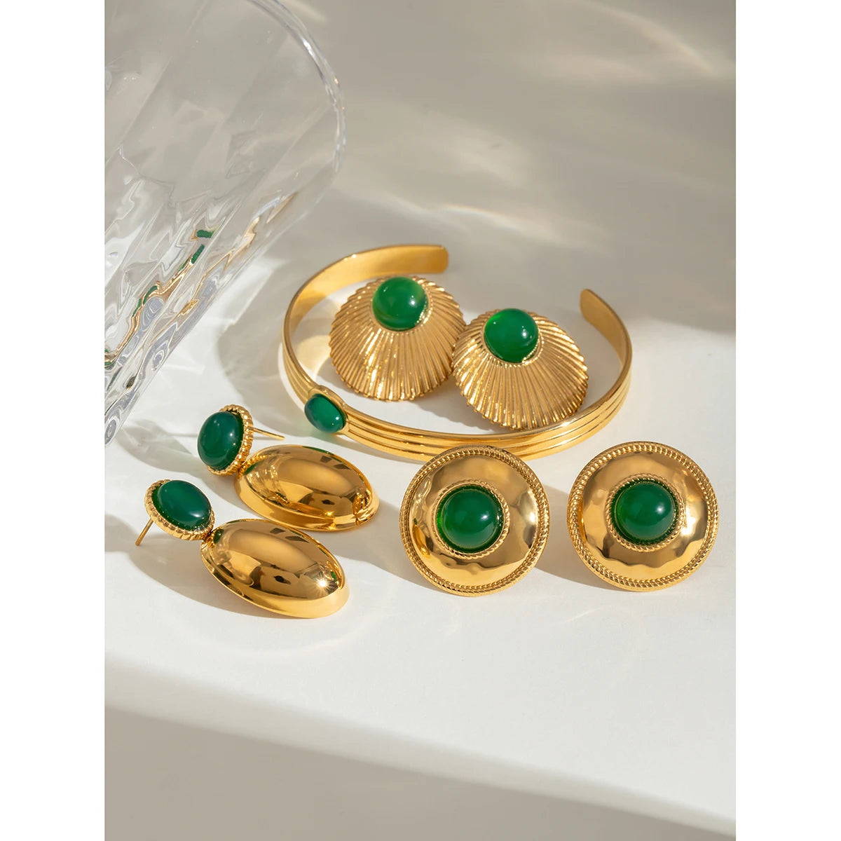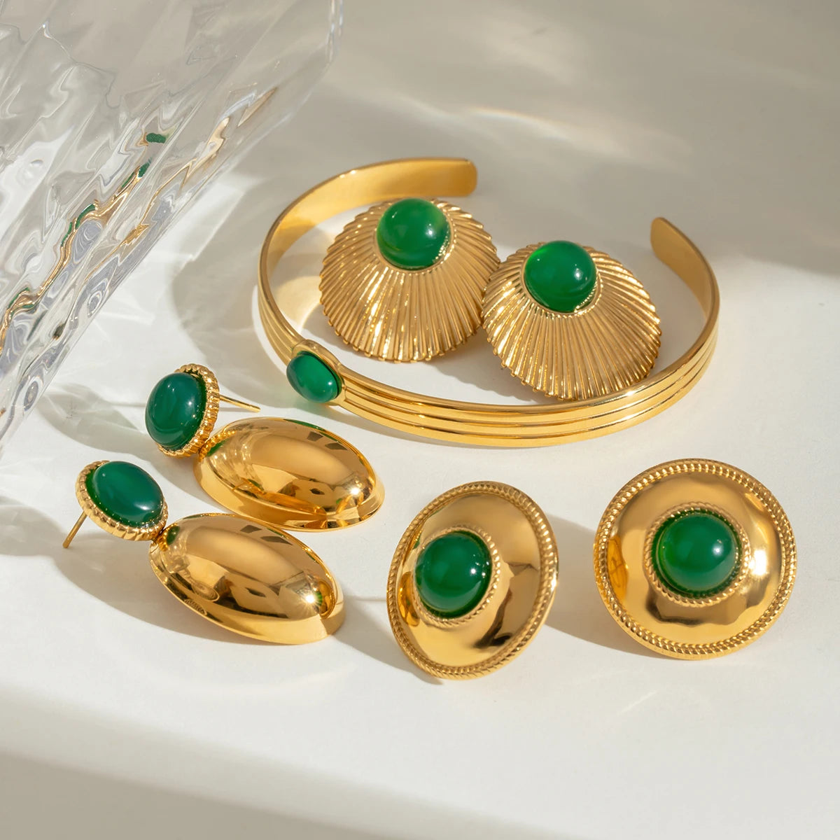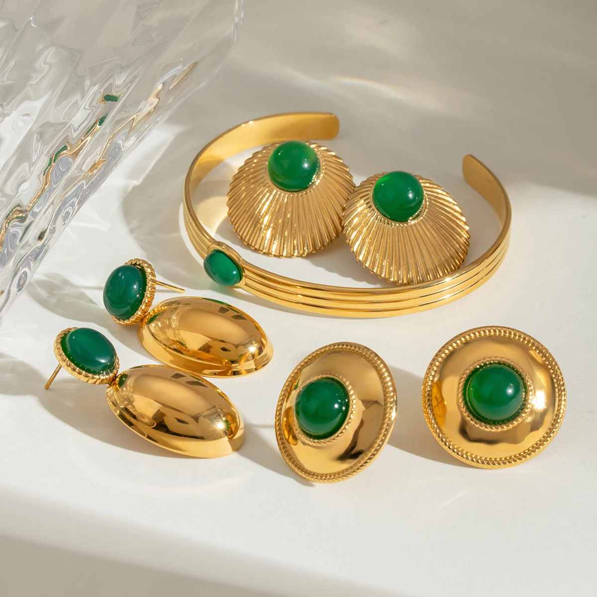 Brincos de Pingente Redondo Vintage de Ágata Verde 18K em Aço Inoxidável Conjunto com Pulseira Aberta Antiferrugem Acessórios de Joias Atraentes
