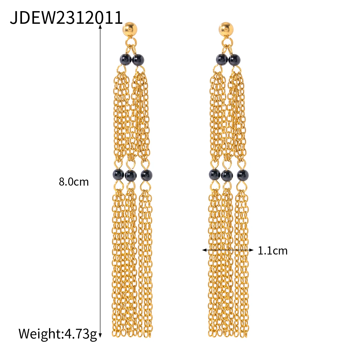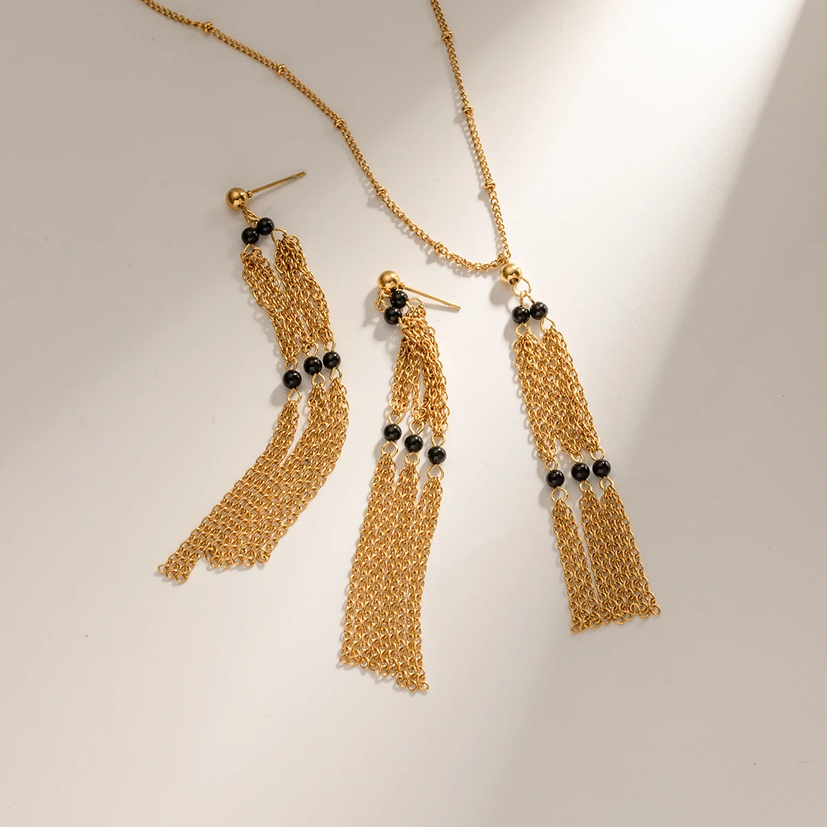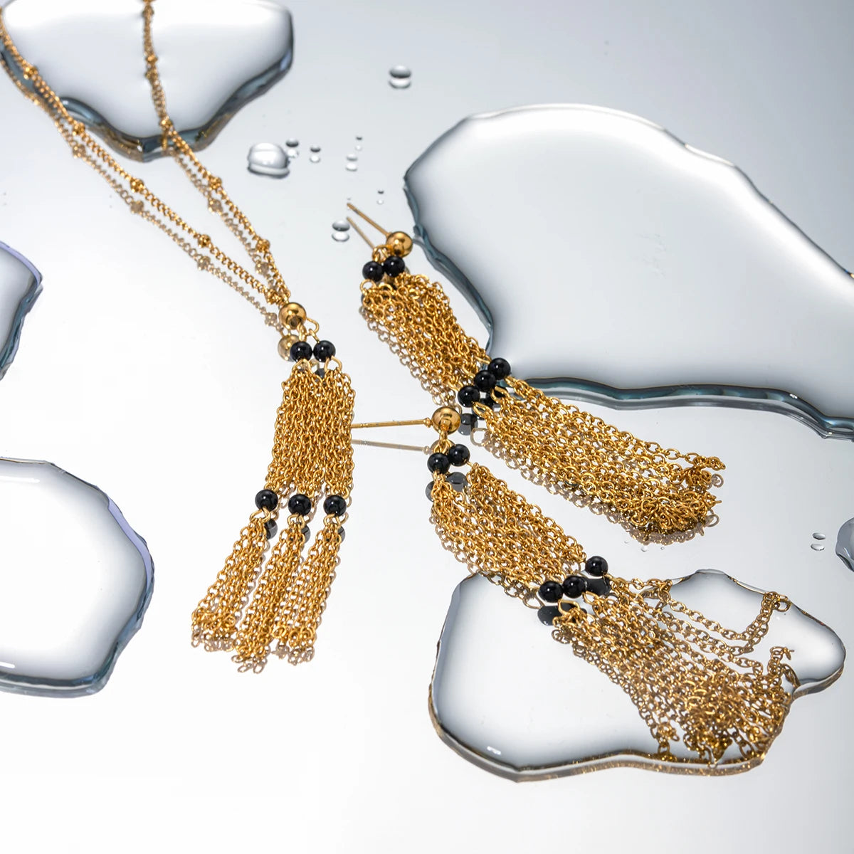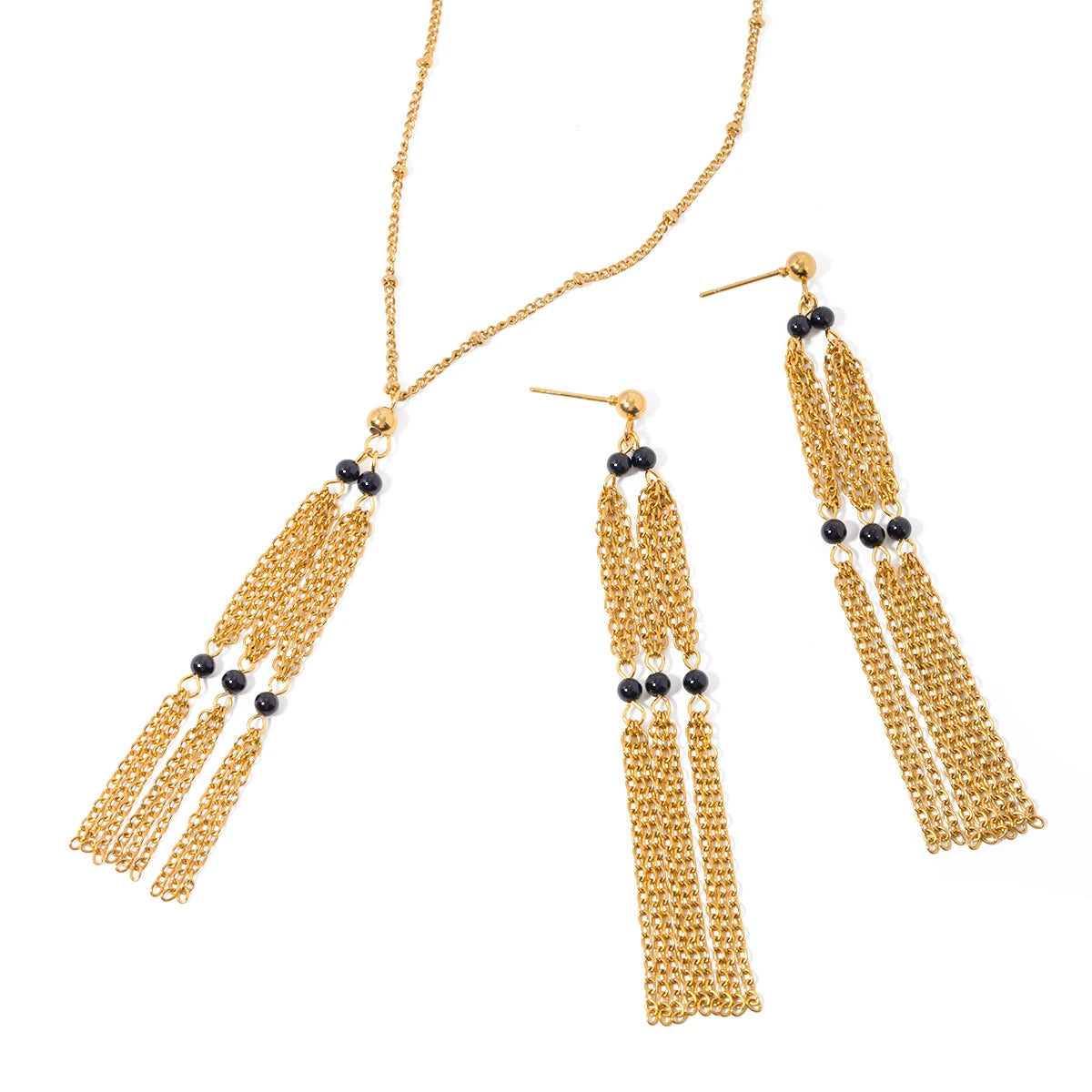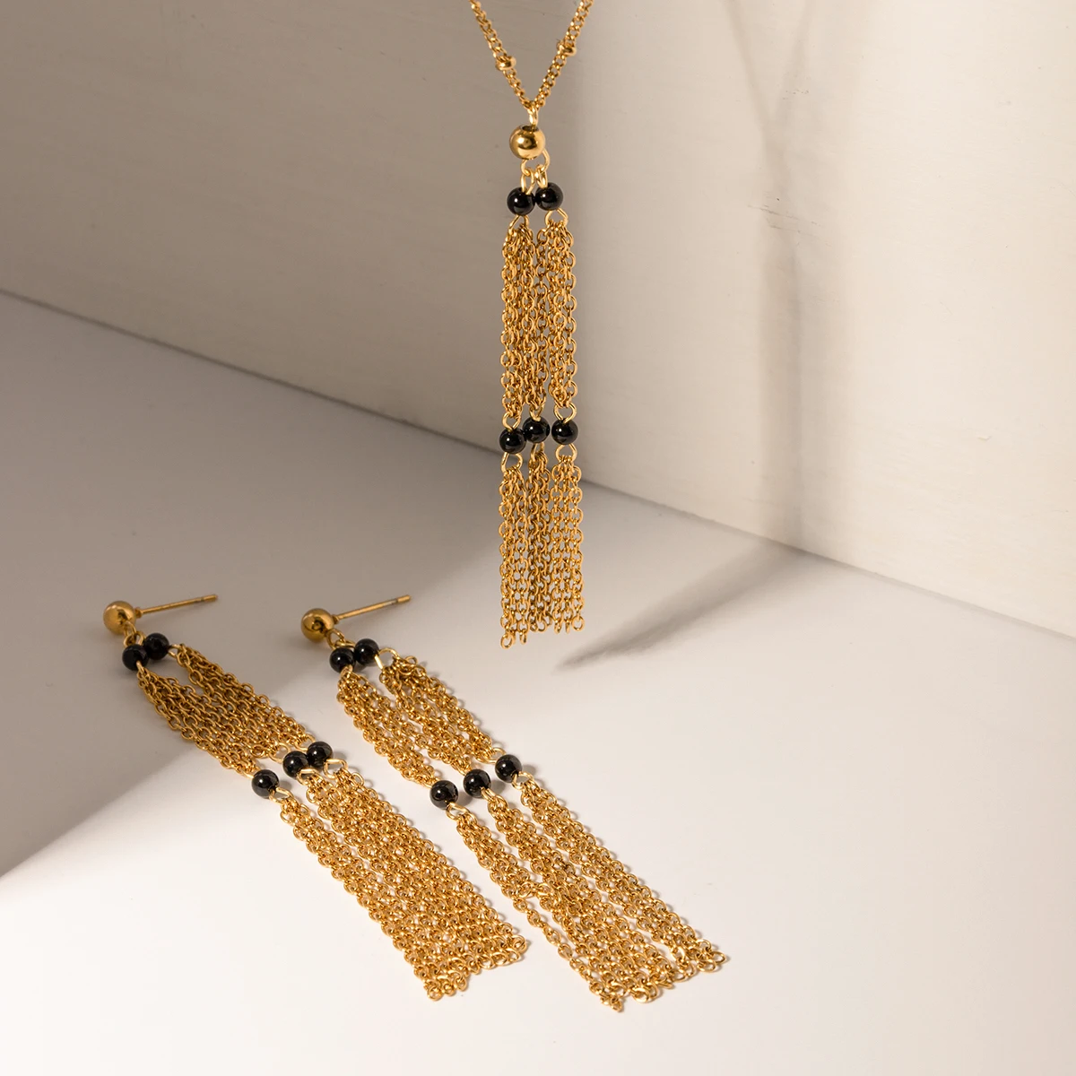 Brincos/Pingente de Colar com Franjas de Pedra Natural Estilo Designer em Aço Inoxidável Banhado a Ouro 18K Previne Alergia Joias de Destaque