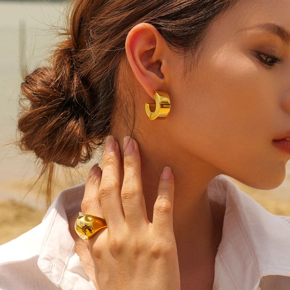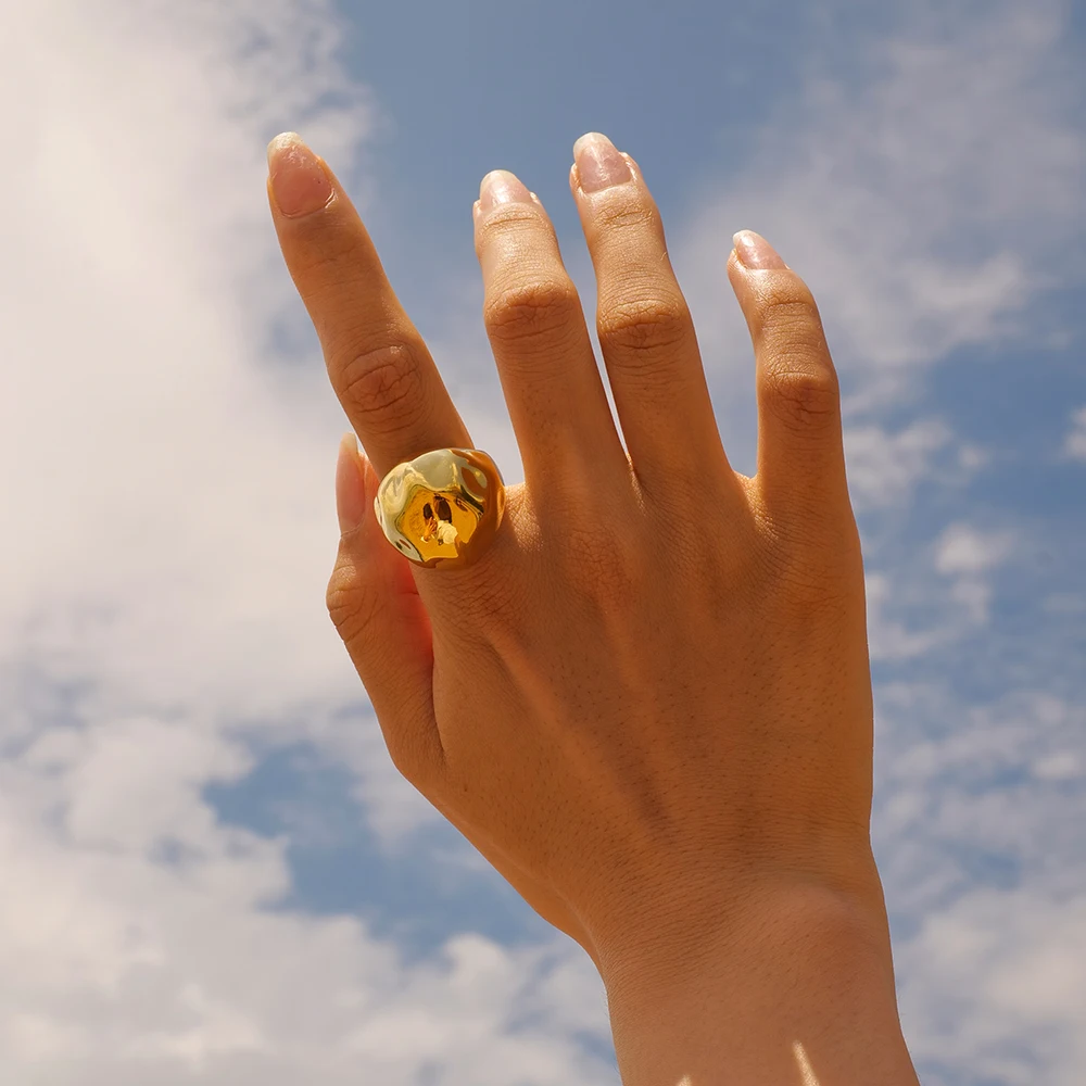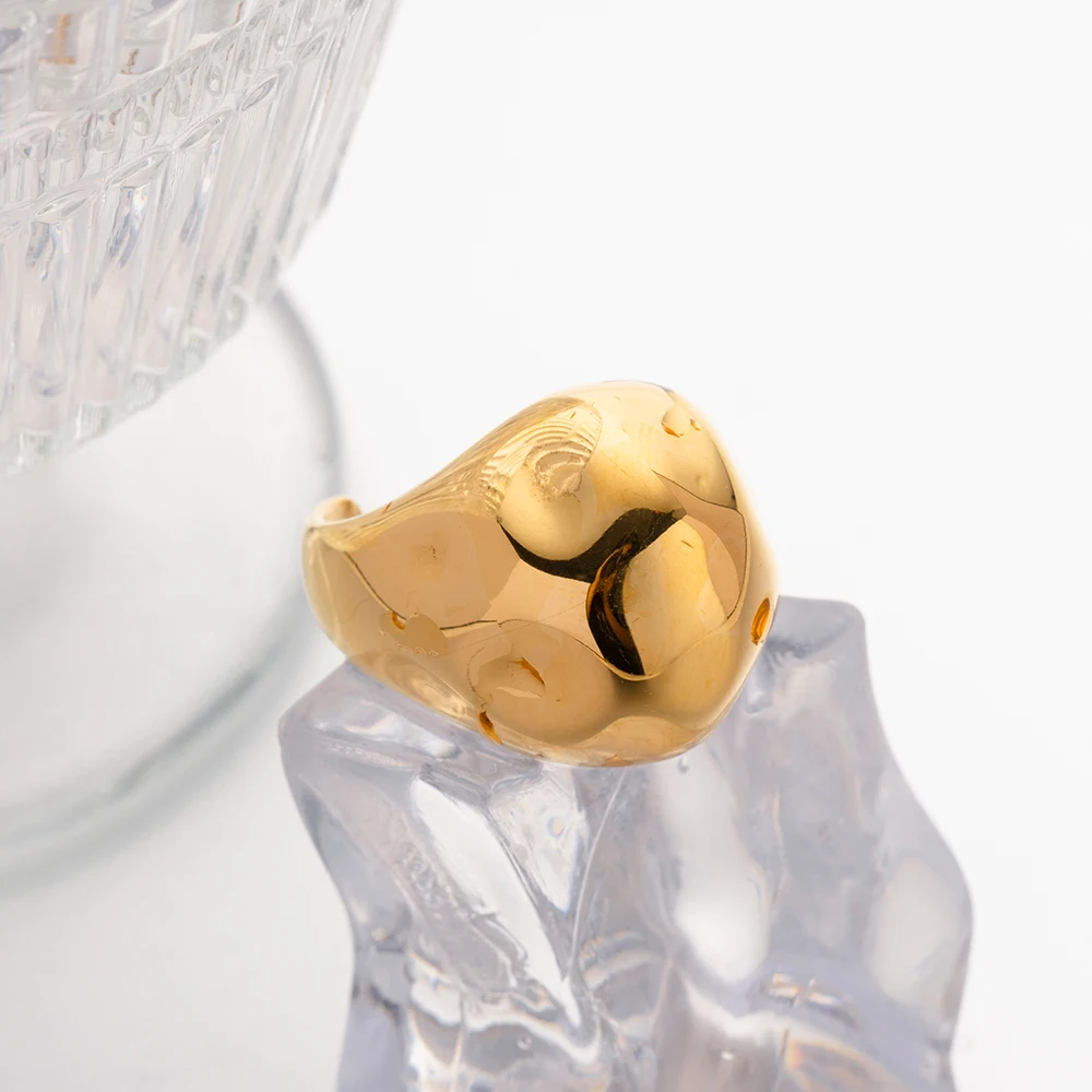 Anel de luxo para dedo feminino em aço inoxidável à prova d'água, grosso, banhado a ouro 18K, formato redondo, textura martelada lisa