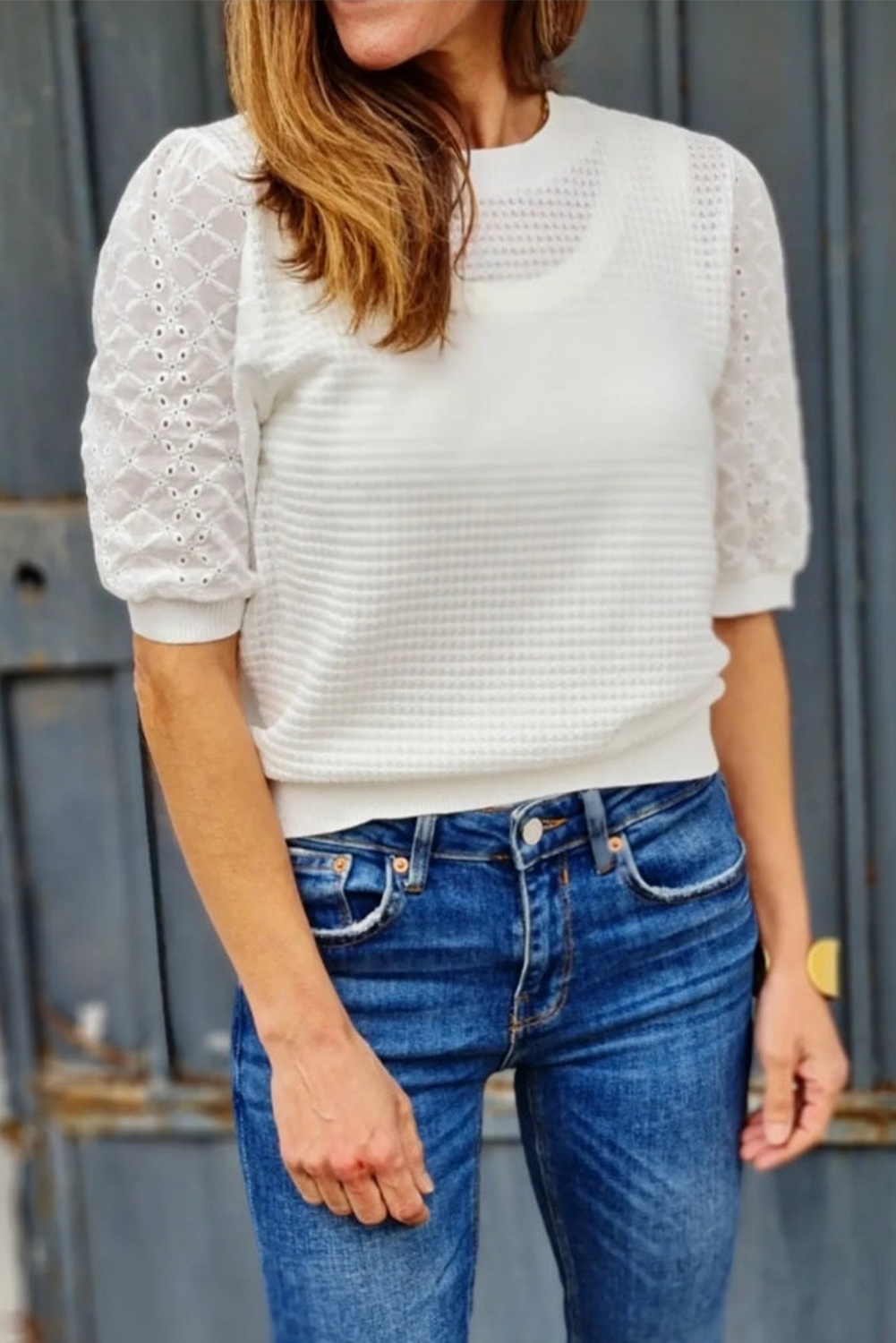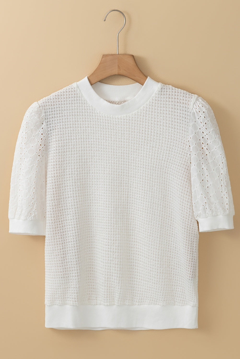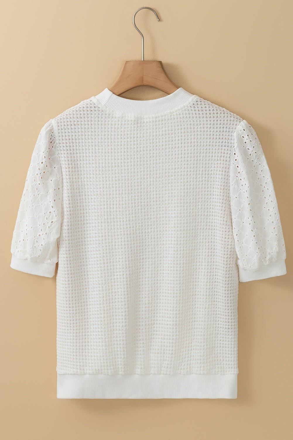 White Broderie Anglaise Puff Sleeve Waffle Knit Tee