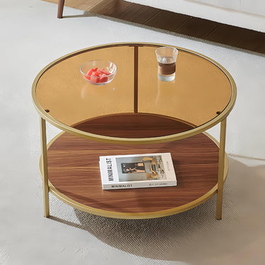 Modern Round Glass Coffee Table with Amber Glass Top, Round Glass Table for Living Room, D30''×H18'', Gold Table Legs Structure & Amber Glass Top